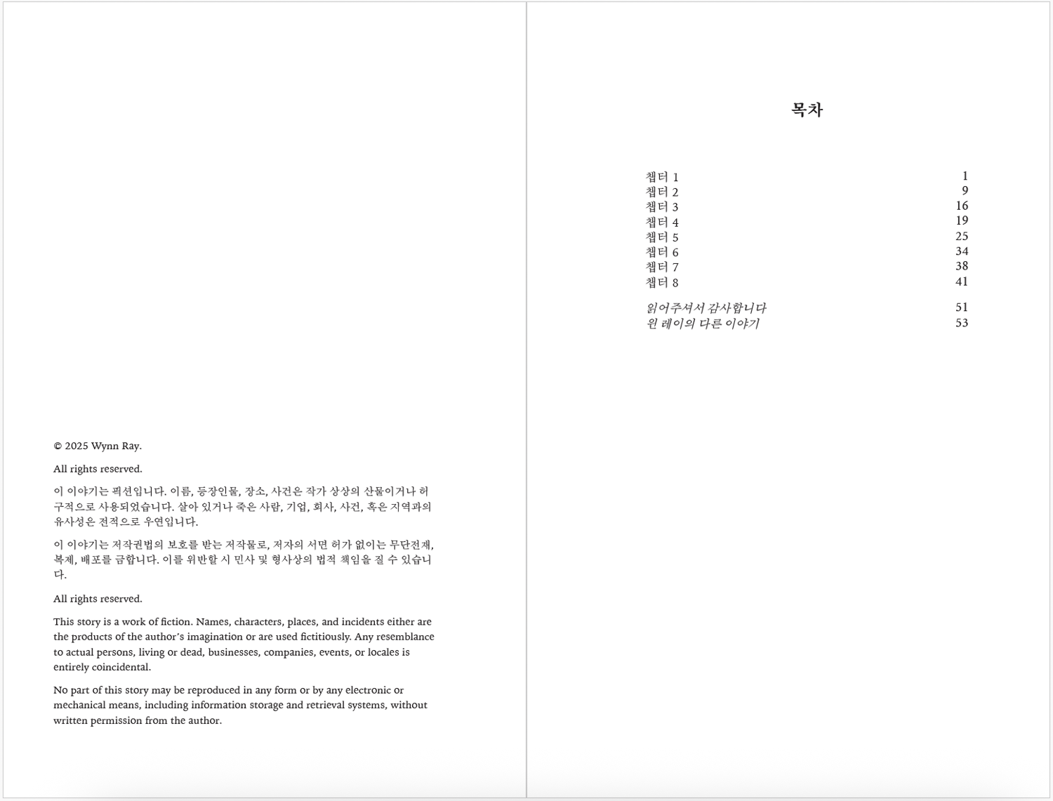 이 이야기의 다른 포맷들은 여기에 나열되어 있습니다: https://imaginariumkim.com/wynn-ray/channel-locked-kor/