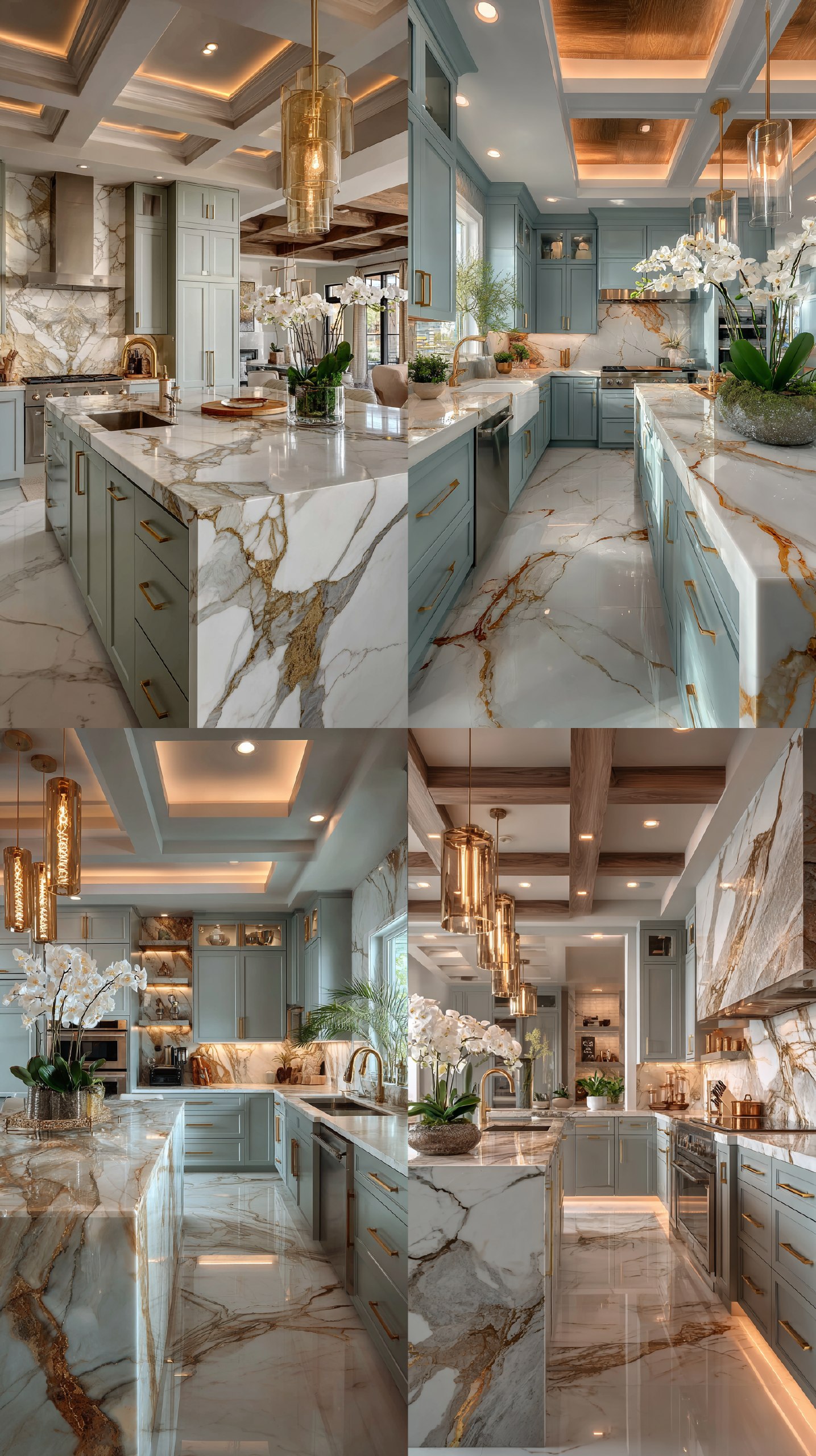 Generate hyper-realistic, wide-angle images of a pristine U-shaped kitchen with soft dove grey shaker cabinets, brushed gold handles, pure white Calacatta marble countertops, and a polished marble floor. Features include coffered tray ceilings, warm recessed lighting, gold pendant chandeliers, and white orchids for elegant styling. Perfect for interior design portfolios, luxury real estate showcases, or AI-generated content for architects and designers. Keywords: luxury kitchen, marble countertops, grey cabinets, architectural photography, high-end interior, Sony A7R, wide-angle shot.