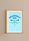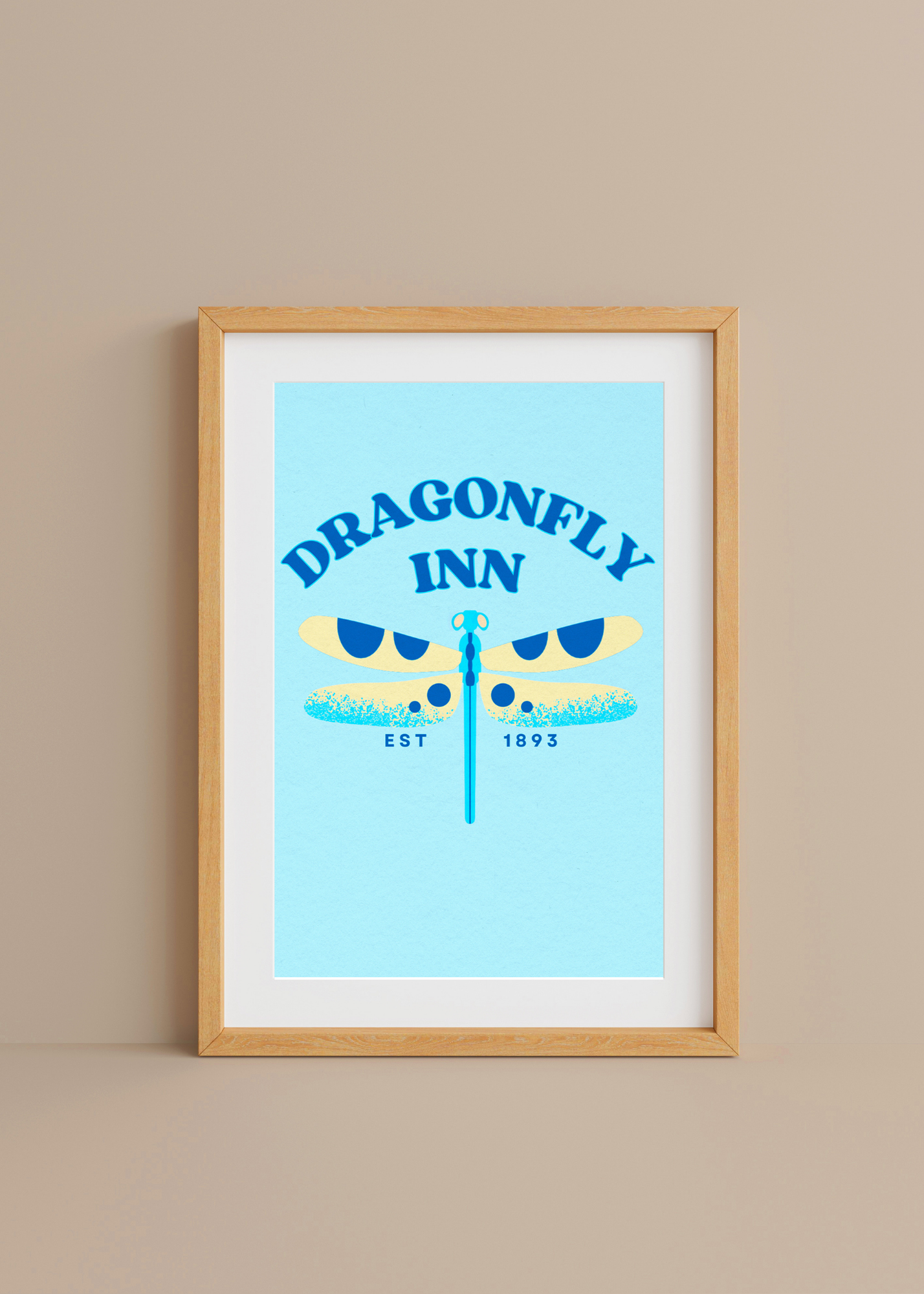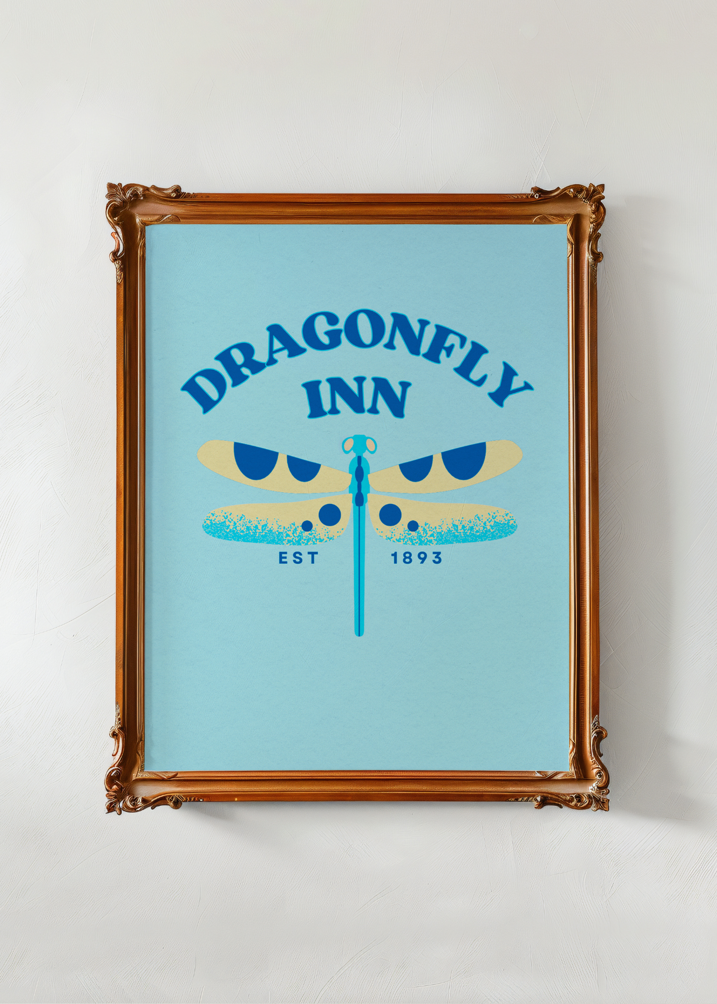 Dragonfly Inn— Like a deep breath on a crisp morning in Stars Hollow, this print brings the gentle magic of the Dragonfly Inn to life. A rich teal background hums with personality—fresh, welcoming, and full of charm—while a delicately illustrated dragonfly takes center stage, its wings in soft cream, deep navy, and bright teal that shimmer like dappled sunlight through the trees.