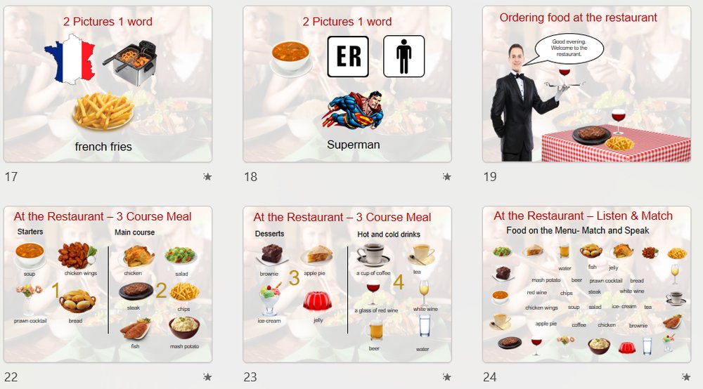 - Vocabulary Development: rich thematic vocabulary covering starters, mains, desserts, drinks, and dining expressions