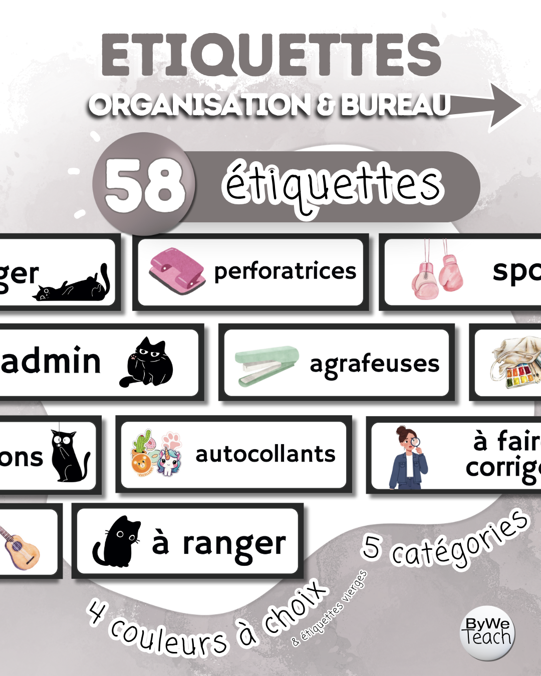 - Organisation enseignant.e.s et bureau 58 étiquettes (à corriger, entretiens, remplaçants, jours de la semaine, les domaines, les tâches des enseignants, ...)