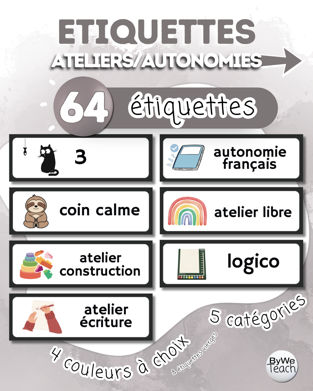 - Ateliers et autonomie --> 64 étiquettes (lecture, maths, écoute, bricolage, 12 ateliers de semaine numérotés, les coins de la classe, etc.)