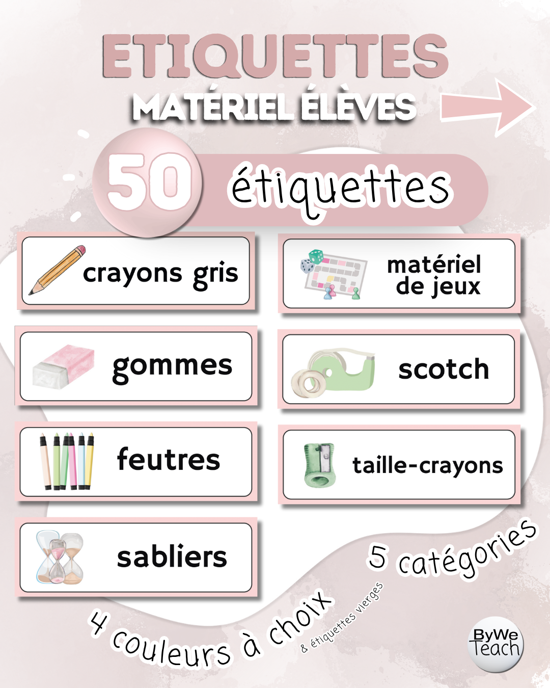 - Matériel scolaire --> 50 étiquettes (gommes, crayons, sabliers, scotch, pamir, etc.)