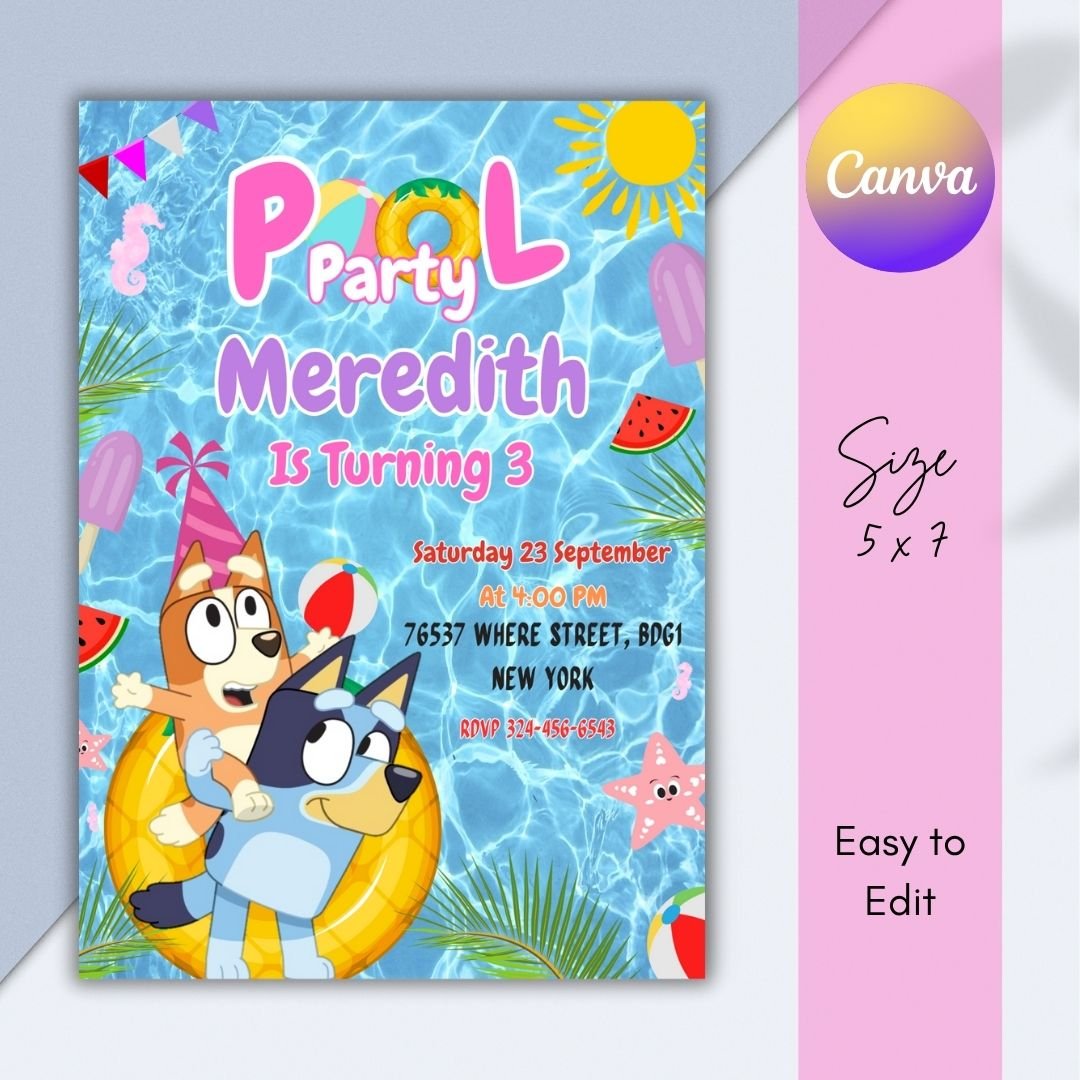 Editable Bluey Pool Party Invitation | Canva Template | Kids Birthday Invite | Printable & Digital | Pool Party Invitation