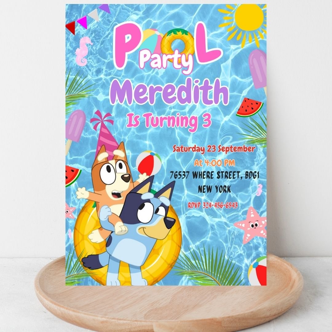 Editable Bluey Pool Party Invitation, Bluey Birthday Parties Idea | Canva Template | Kids Birthday Invite | Printable & Digital | Pool Party Invitation