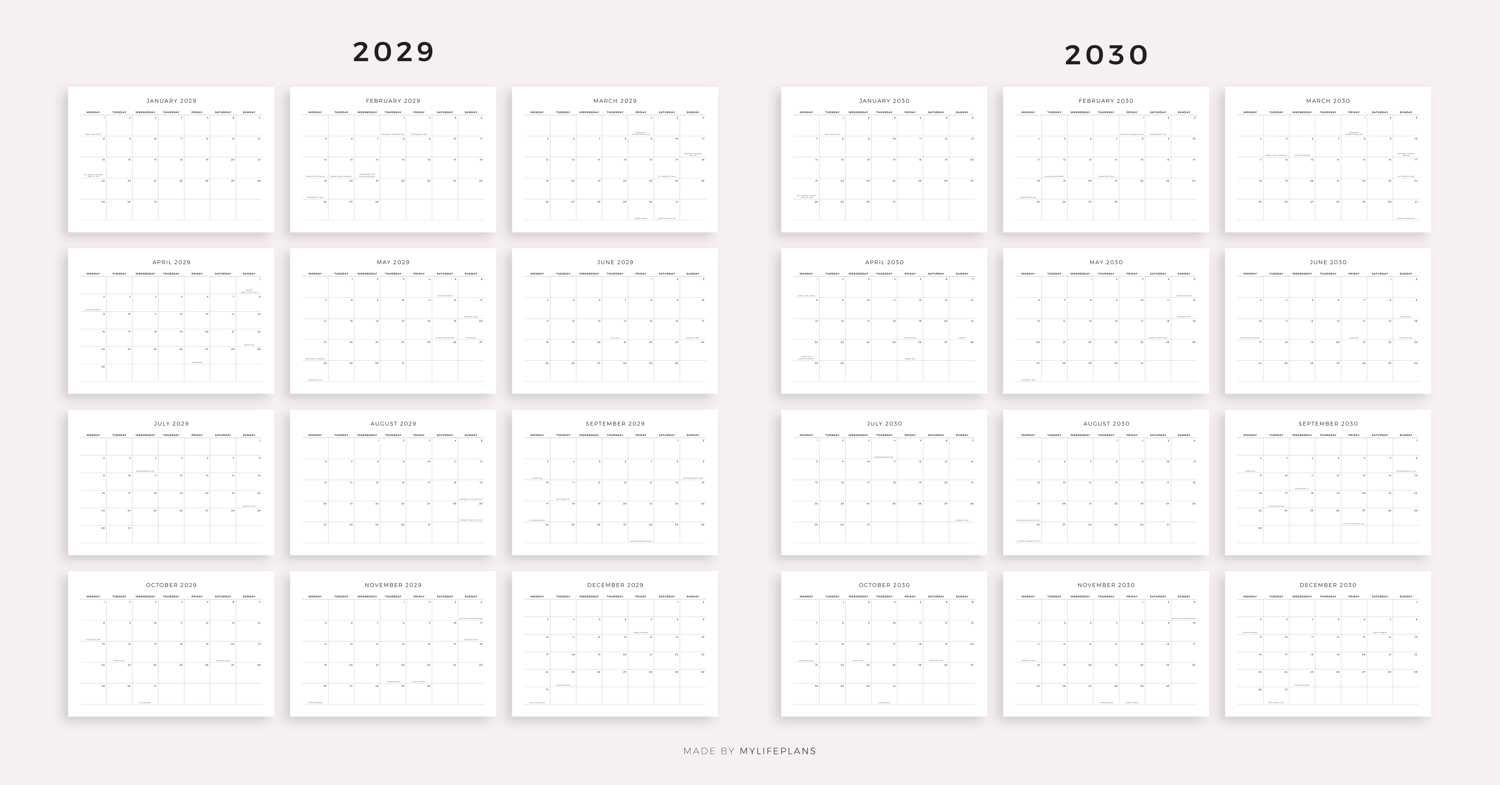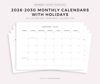 These are printable 2026–2030 monthly calendars with holidays — just download, print, and start using it right away.