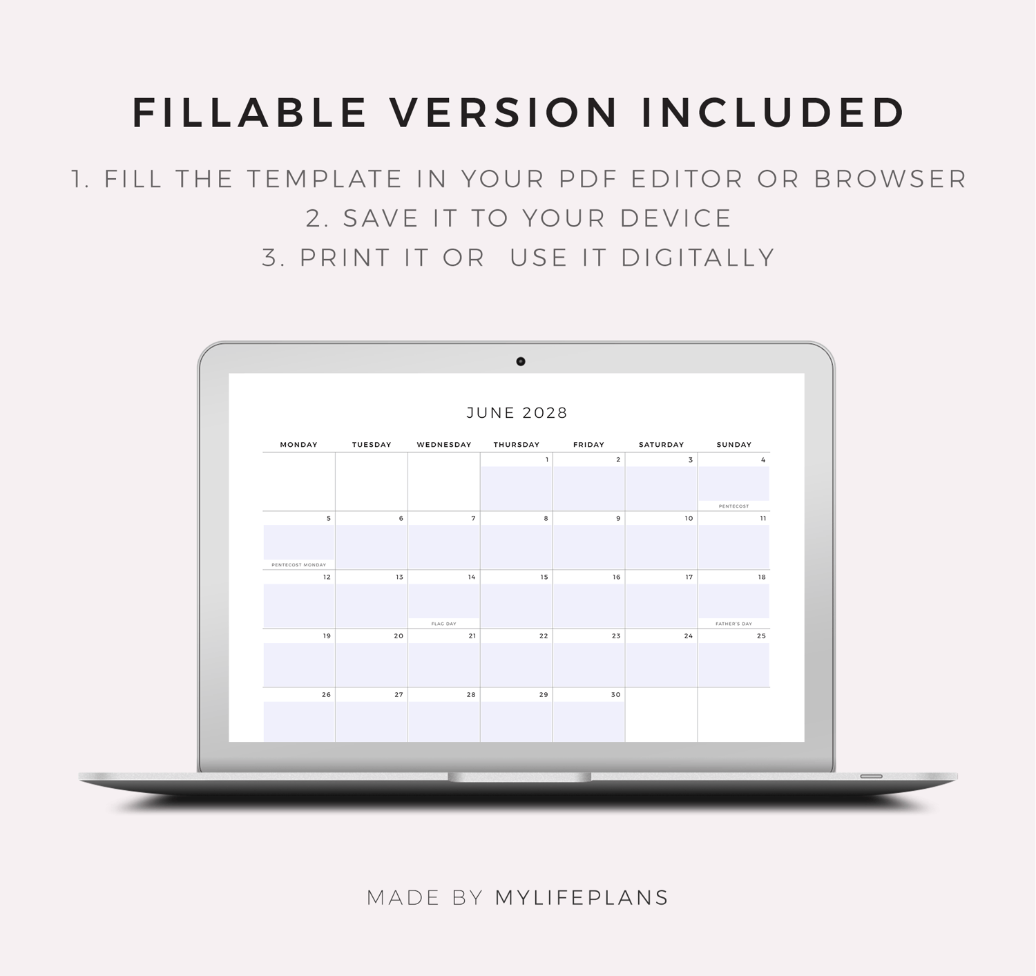 2026-2030 Monthly Calendars with Holidays, Landscape, Printable & Fillable, A4/Letter Size