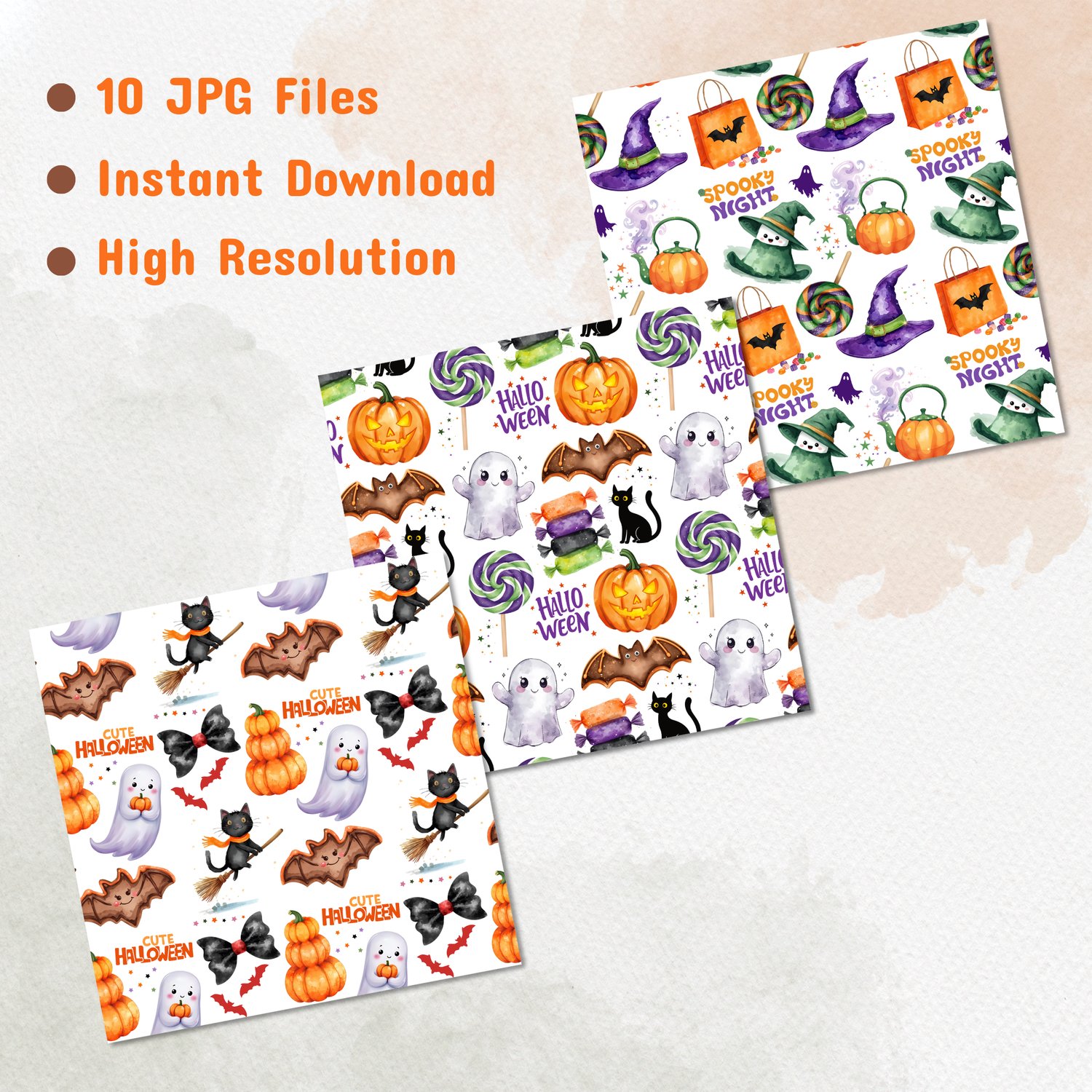 Celebrate the spooky season with this set of 10 cute Halloween watercolor seamless patterns. Each digital pattern features beautifully illustrated elements such as playful ghosts, candy corns, witch’s shoes, striped lollipops, witch’s broomsticks, jack-o’-lantern buckets, bat-shaped cookies, black cats and more. Designed in a cohesive watercolor style, these seamless patterns combine vibrant colors and detailed artwork to create a high-quality, ready-to-use collection for all your Halloween-themed creative ideas.