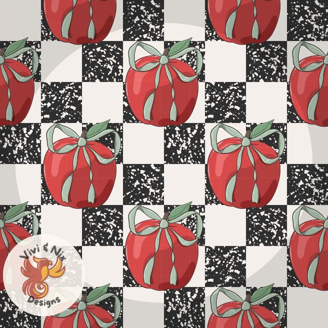 This seamless pattern was designed with a fun teacher + school aesthetic, combining classic composition notebook texture with bright apples and soft bow details.