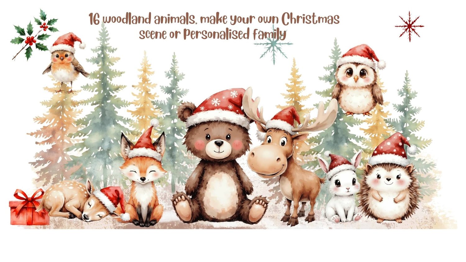 Woodland Animals Christmas family Clipart Set – 36 PNGs, 16 animals, 20 elements incl backgrounds. See pics for what’s included.