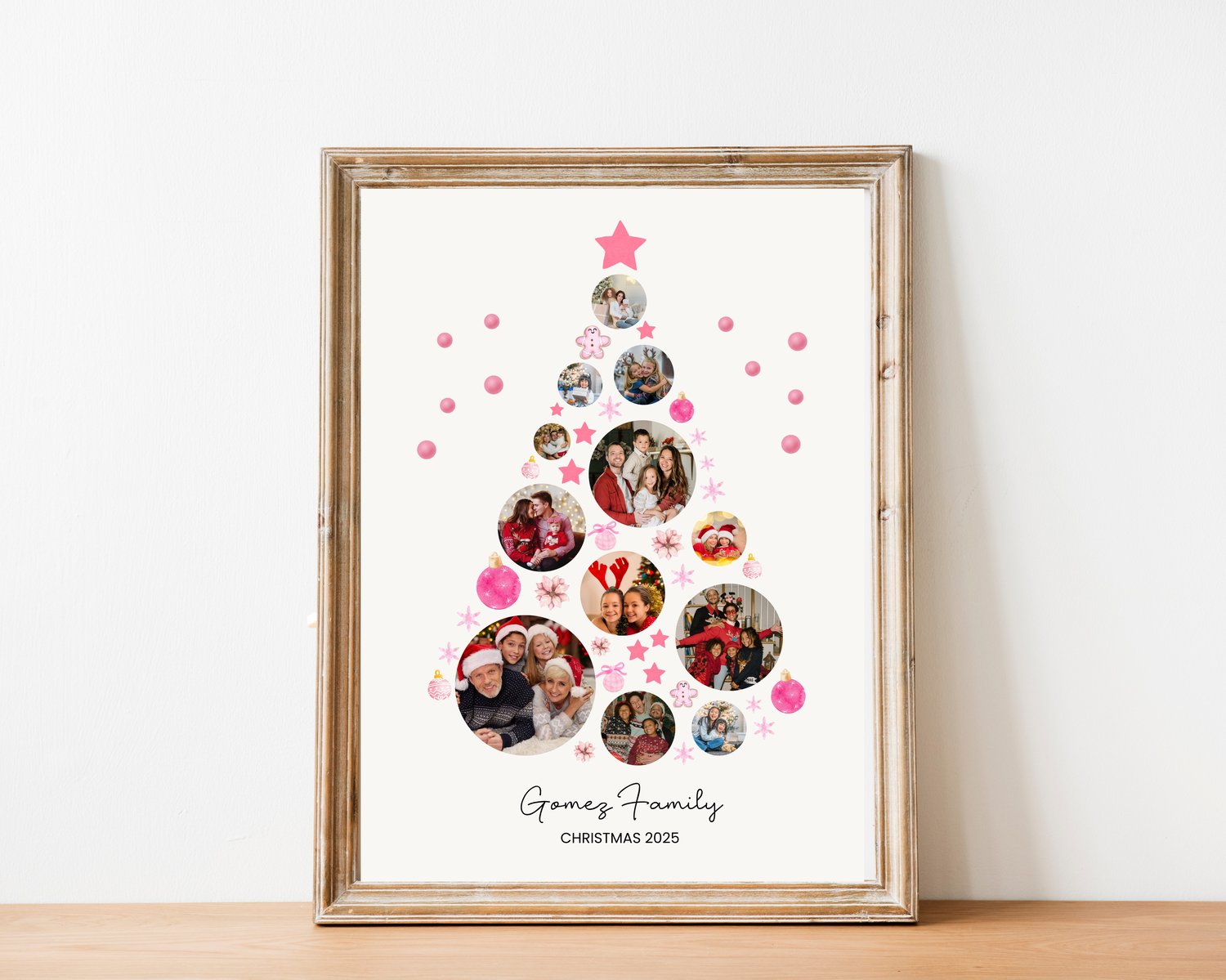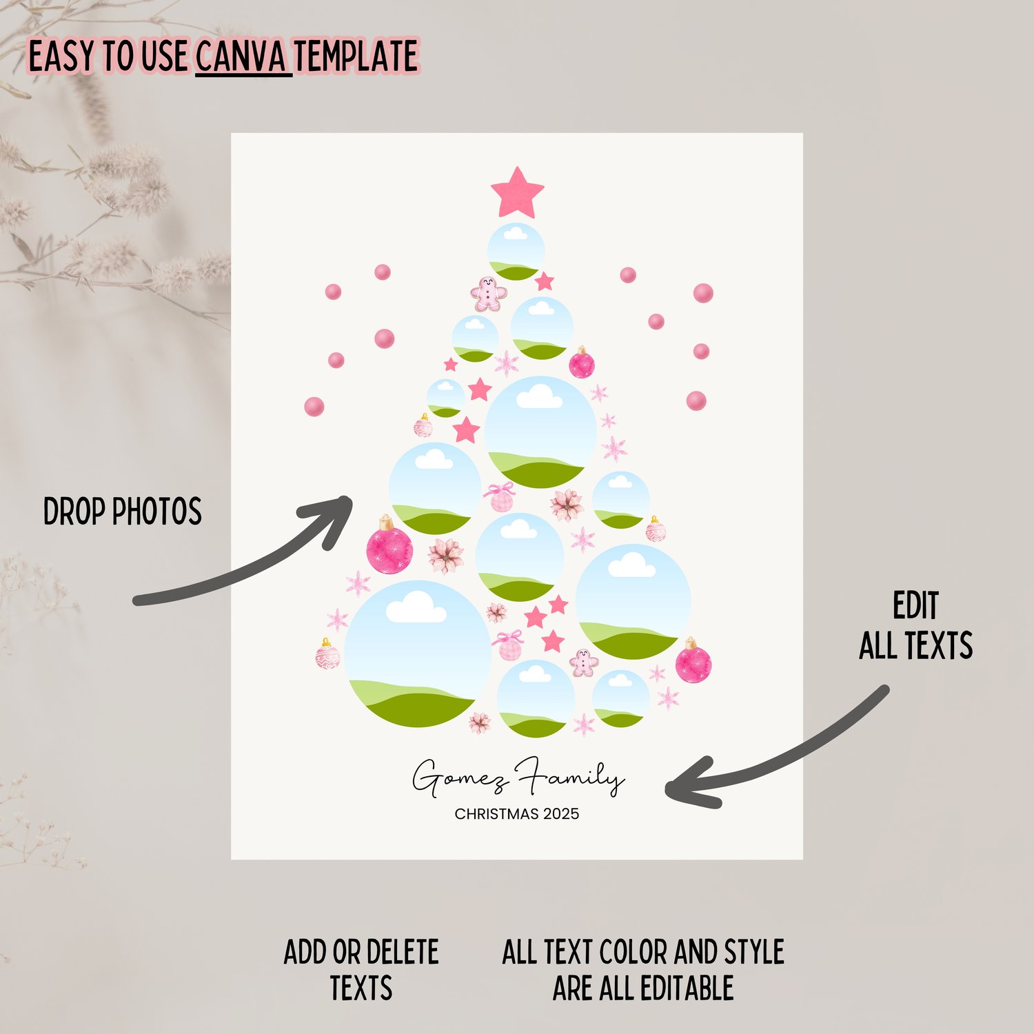 Editable Christmas Tree Photo Collage Template, Holiday Family Portrait, Year End Photo Gift, Pink Theme Aesthetic DIGITAL