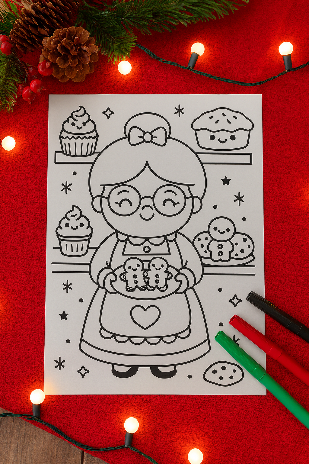 Mrs. Claus’s Cozy Bakery Coloring Sheet | Christmas Holiday Fun for All Ages