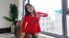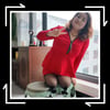 Tina, dressed in a red dress and wearing black, crawled on the bed.