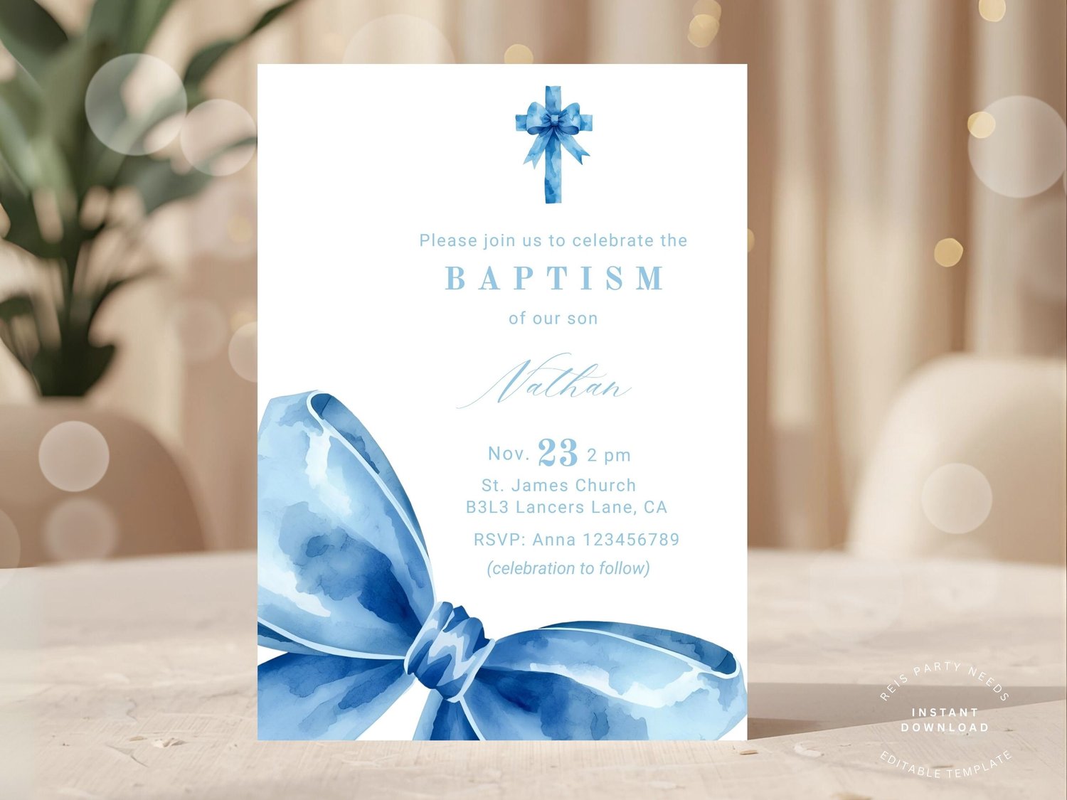 Baptism Invitation Boy Baptism Invitation Preppy Blue Bow Christening Invite Editable Template Coquette Blue Bow Invite Printable