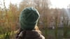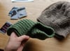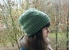 Version avec fil de type “Aran” : le modèle présenté (bonnet vert) est tricoté en Quince and Co Osprey, 100% laine, 170 yards (155 m) / 100g.