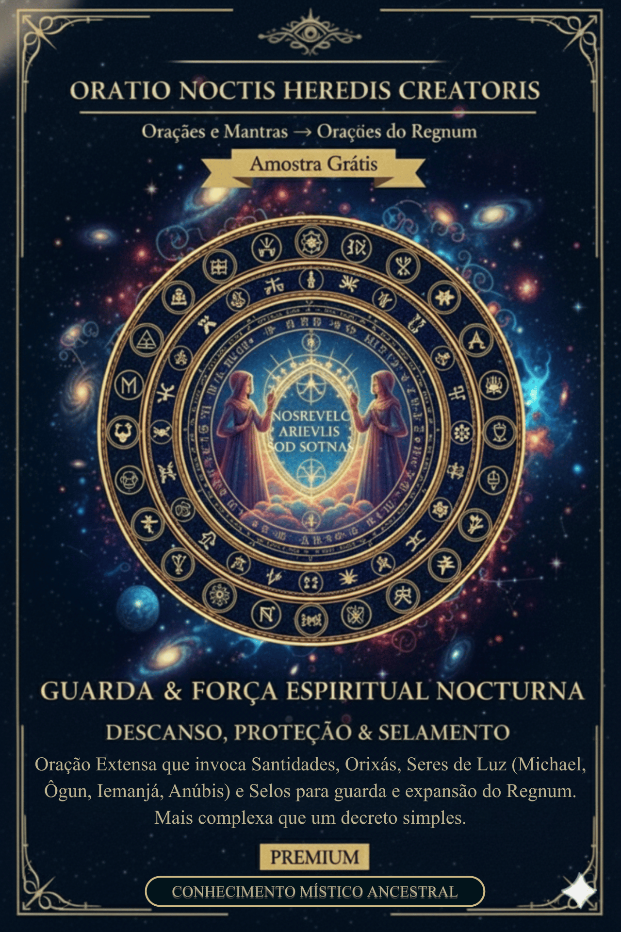 Mais do que uma oração, é uma Vigília Mística. Este Arcano convoca uma assembleia de 5 Guardiões (Miguel, Anúbis, Ogum, Yemoja e Krishna) para selar sua alma, mente e corpo enquanto dorme. Você aprenderá os Seli Regni Nocturni (Selo do Silêncio, da Guarda, do Nome Espelho) para blindar seu descanso.