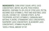 Corn Syrup, Sugar, Apple Juice Concentrate, Gelatin, Modified Food Starch (Potato), Pectin, Citric Acid, Malic Acid, Ascorbic Acid (Vitamin C), Modified Food Starch (Corn), Sodium Citrate, Coconut Oil*, Fruit and Vegetable Juices Added for Color (Black Carrot, Purple Carrot, Blueberry, Purple Sweet Potato, Cherry, Radish), Natural Flavors, Beta-Carotene (Color), Carnauba Wax*, Strawberry Juice Concentrate, Raspberry Juice Concentrate, Blackberry Juice Concentrate.