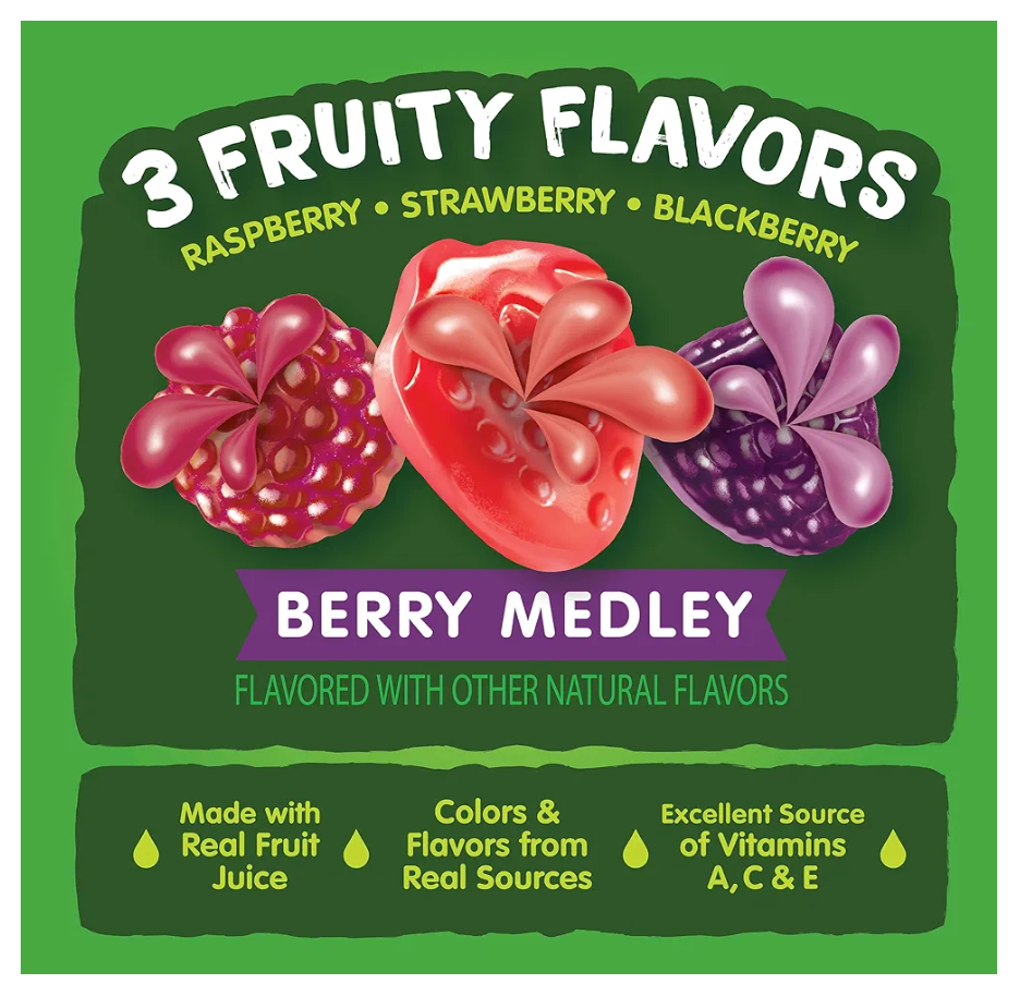 REAL JUICY, REAL GOOD: This box includes 40 individually wrapped 0.8 ounce pouches of fruit flavored shaped snacks in 3 berry-licious flavors of strawberry, blackberry, and raspberry