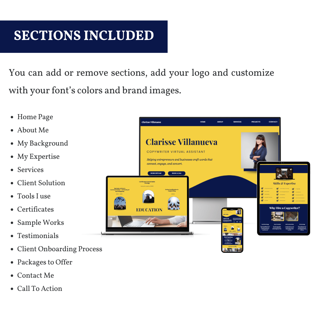 đŸ”¹ Pages: Home, About, Education, Work Experience, Services, Skills & Expertise, Tools, Work Samples, Packages, Certifications, Onboarding Process, Testimonials, Client Solution, Contact CTA.