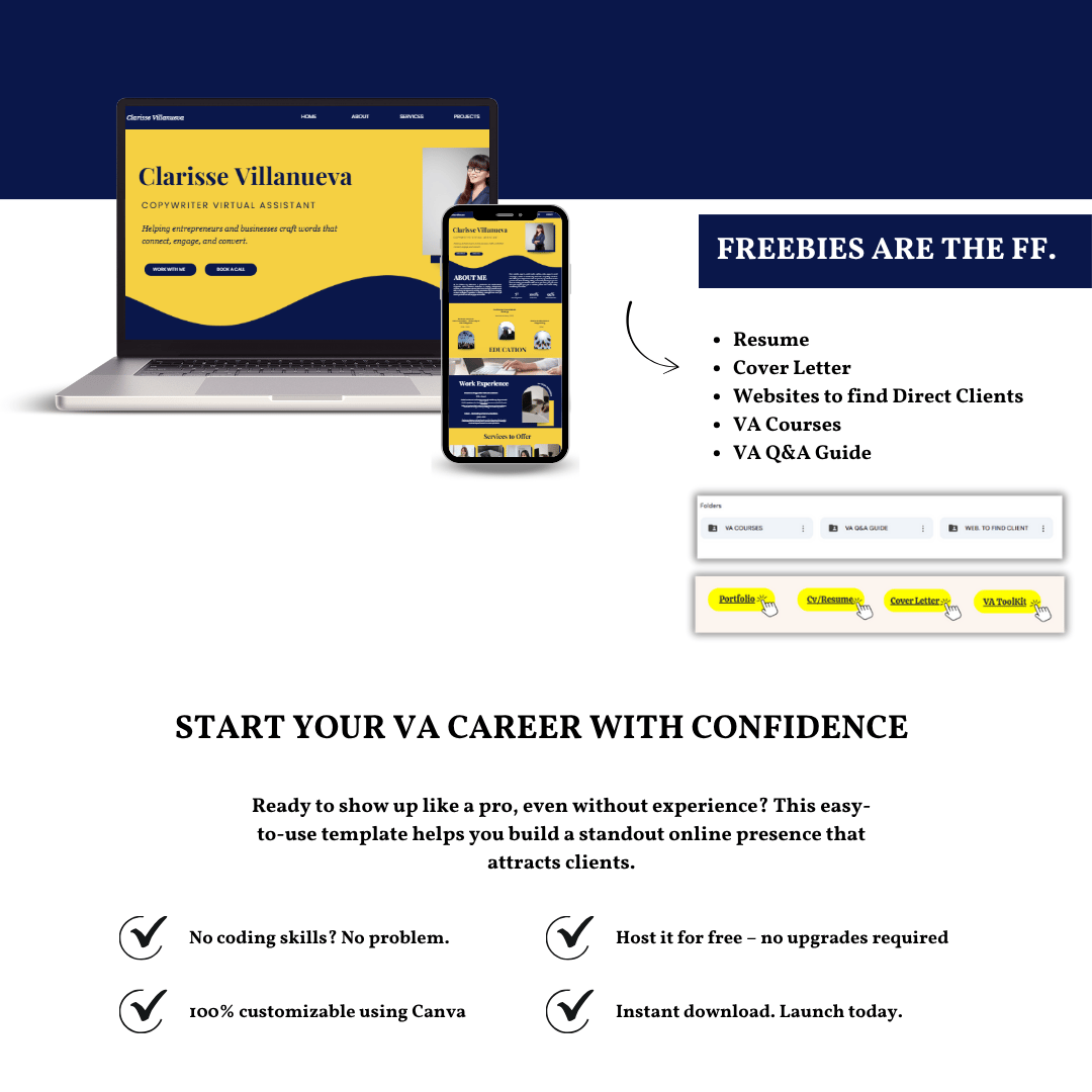 - FREE: Resume, Cover Letter, Websites to find Direct Clients, VA Courses, and VA Q&A Guide.