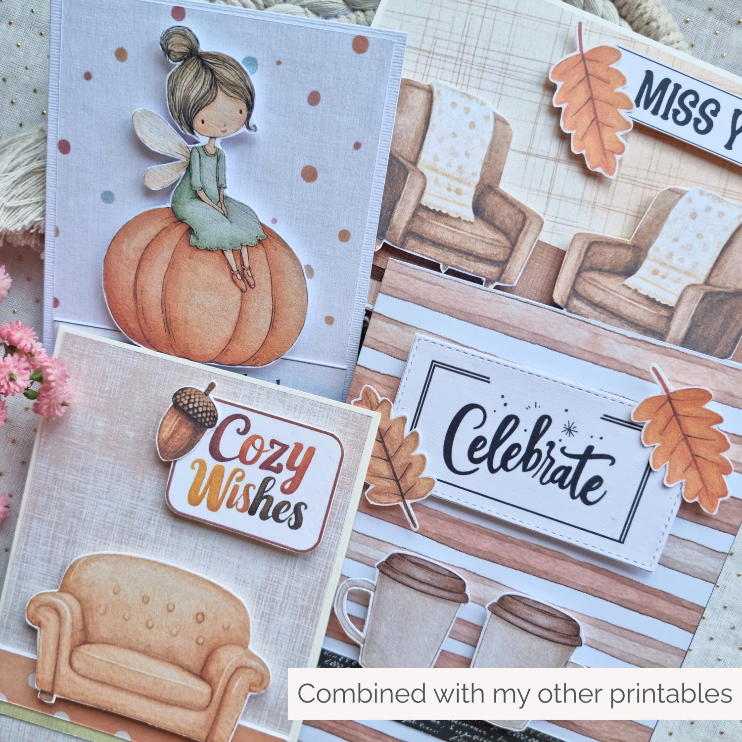Love card making? Make quick, easy and cute greeting cards with this printable card making kit, perfect for card making beginners and paper crafters. This kit features adorable fall season illustrations and card making elements in autumn colors, ideal for making handmade fall greeting cards.