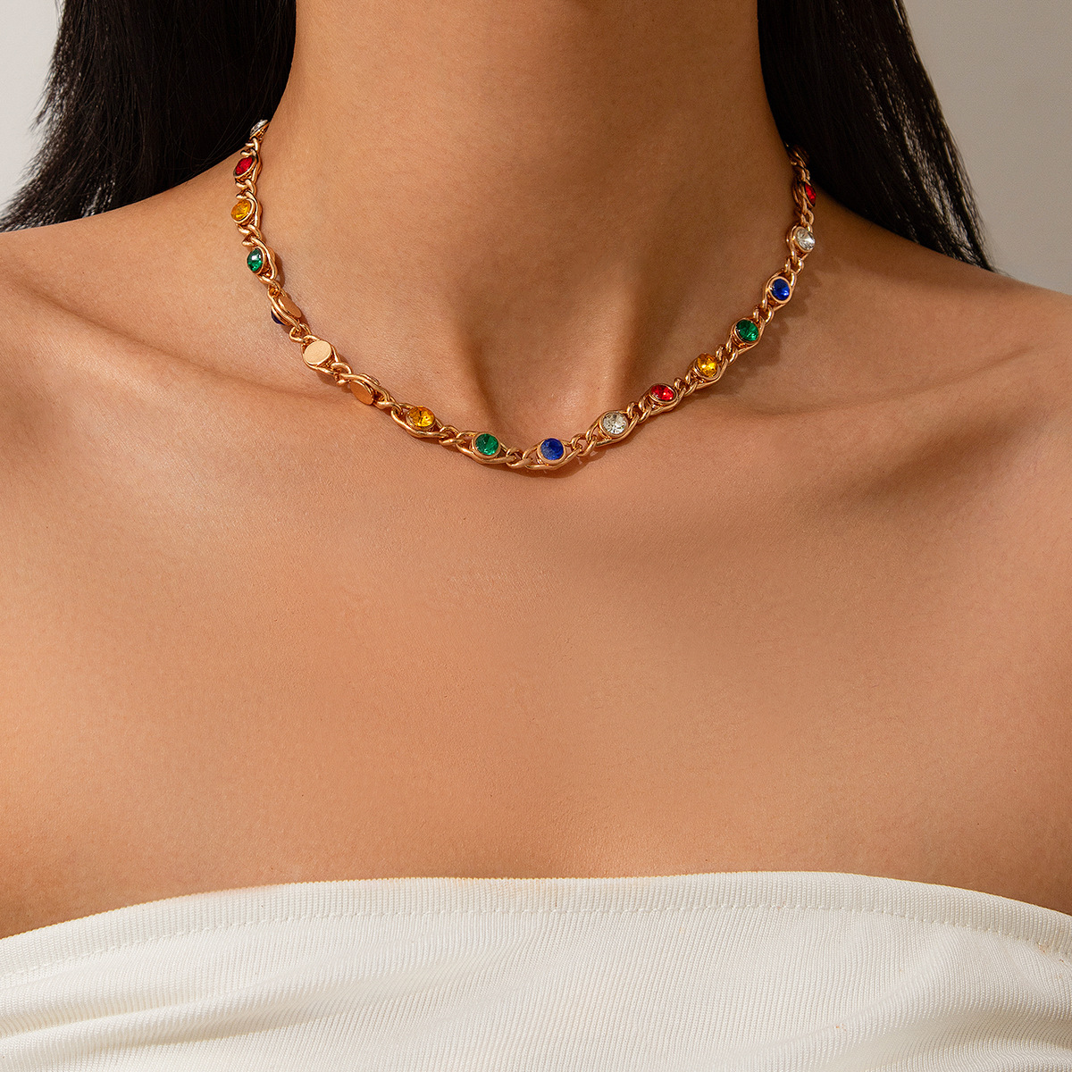 Sweet and colorful inlaid rhinestone chain necklace with irregular metallic texture collarbone chain set