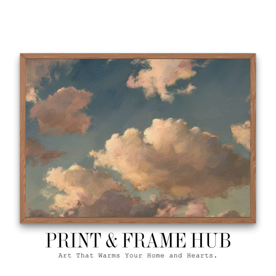 A tranquil painting capturing the beauty of fluffy clouds against a soft, blue sky. This piece brings a sense of peace and calm to your home, making it a perfect addition to your walls.