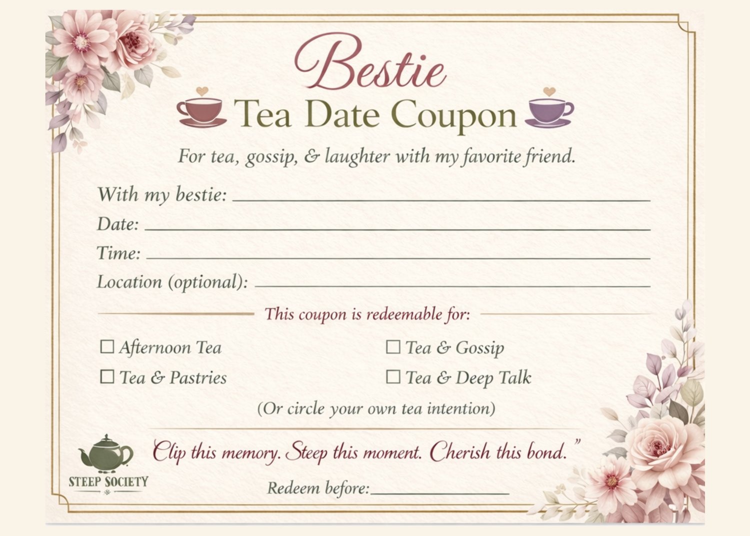 Celebrate friendship with this elegant Bestie Tea Date Coupon Printable — the perfect keepsake for tea lovers who cherish meaningful moments. This printable tea invitation card can be gifted for birthdays, holidays, or spontaneous teatime plans. Whether you’re planning a cozy tea party, tea tasting outing, or afternoon tea ritual, this coupon adds sentimental charm to the experience. Designed with a soft vintage tea aesthetic, it also makes a beautiful scrapbook memory. Perfect for tea party invitations, tea invitations printable, teatime gifts, and tea lover experiences.