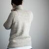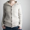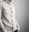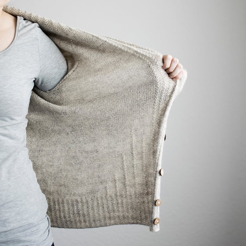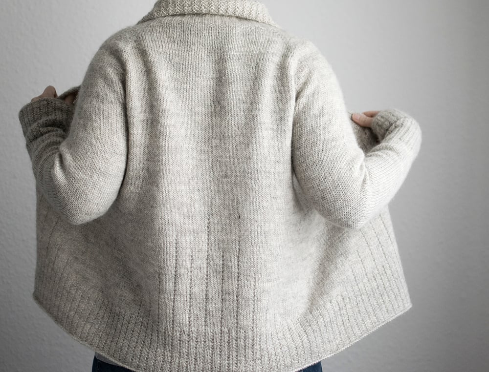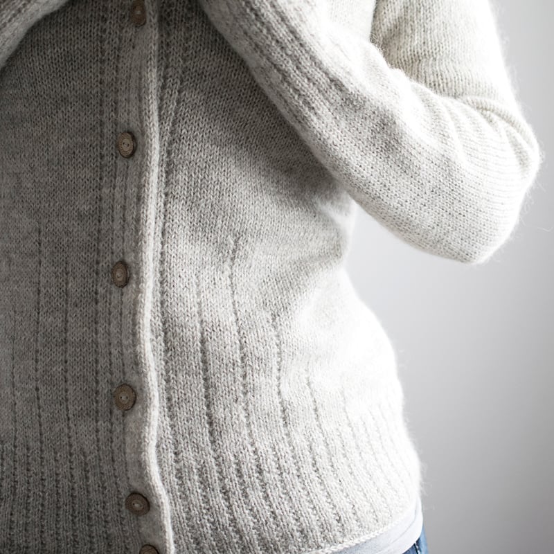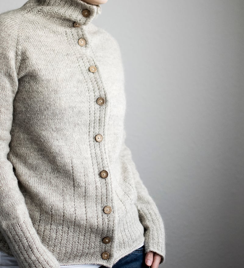 This classic cardigan is worked seamlessly from the top-down, the buttonband included. After starting with the high collar and buttonband, the neck and yoke are worked with short rows and raglan increases. Sleeve sts are placed on hold, to continue with the body only. They are picked up again after the body is completed and worked top-down in the round. Broken rib stitch pattern at the collar, hem, cuffs and buttonband produce a slightly textured look, and some subtle lines at the fronts and back add a little extra detail to it.