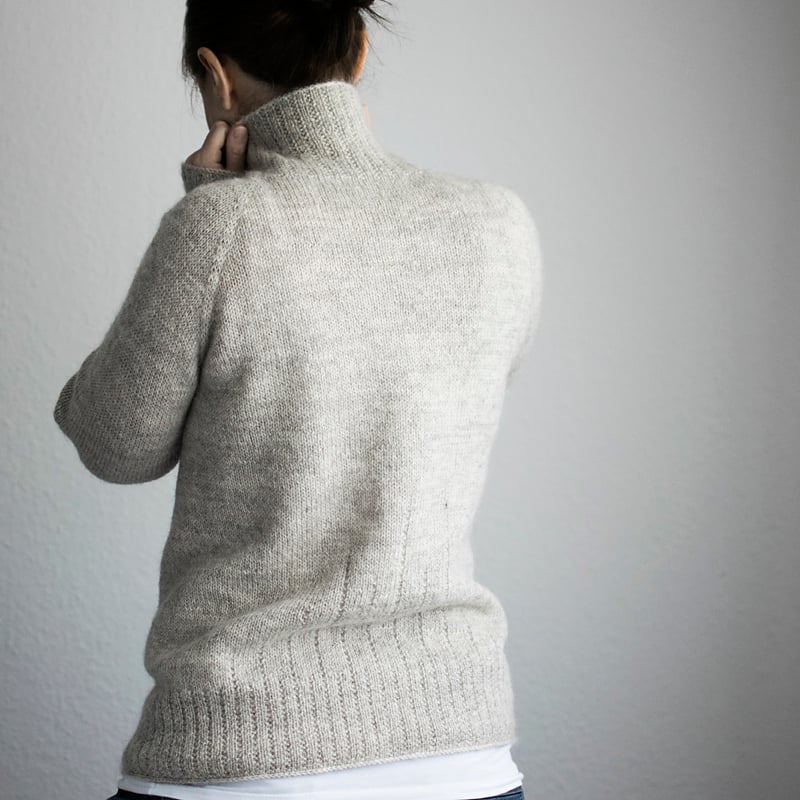 22.5 sts and 32 rows in 10 cm/4” on 4 mm/US 6 needle in stockinette (blocked).