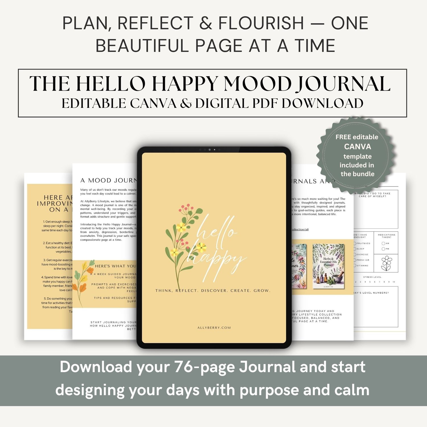 Prompts for gratitude, mood, self-care, intentions, and joyful wins—your 5-minute daily lift.