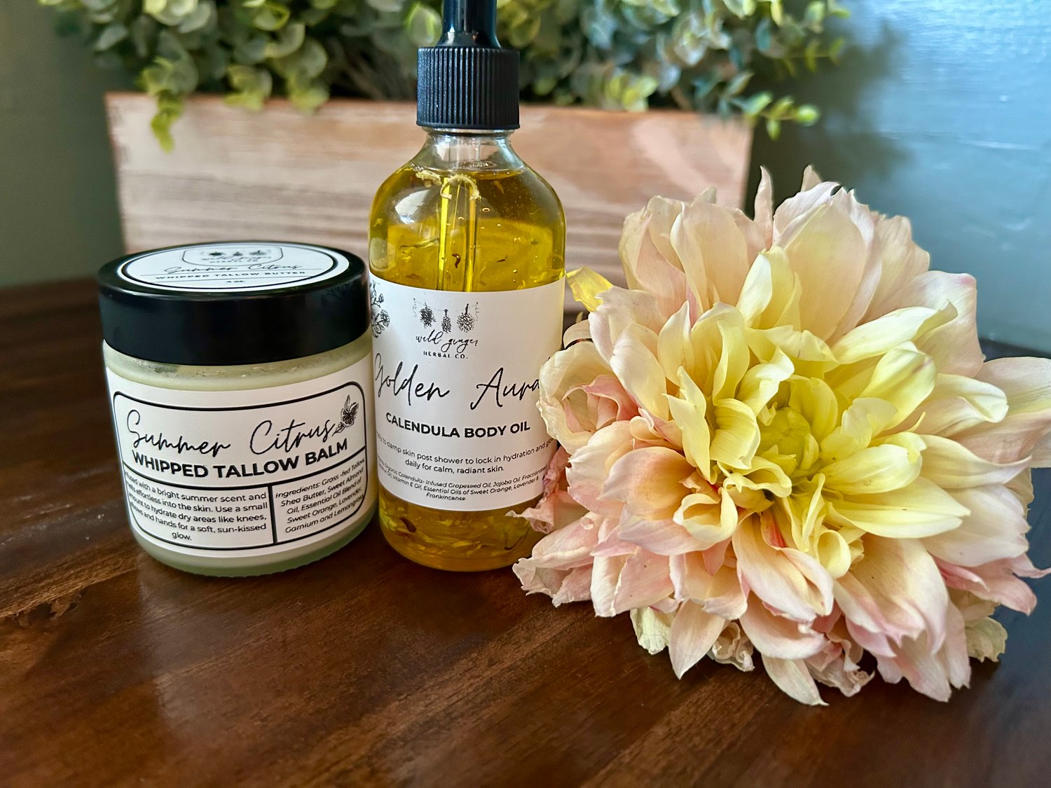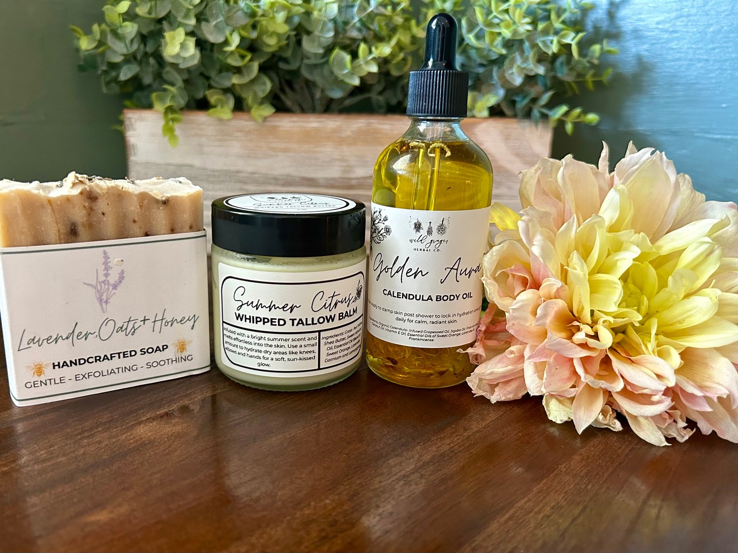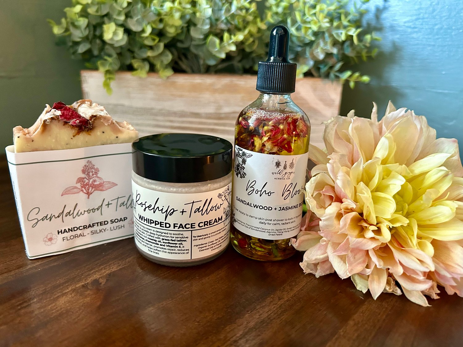 Indulge in the slow beauty of nature with the Sacred Skin Trio—a full-body care set crafted for deep hydration, gentle cleansing, and skin-loving aromatherapy. This trio blends nutrient-rich tallow, lush floral oils, and grounding sandalwood into a ritual that soothes the senses and restores glow from head to toe.