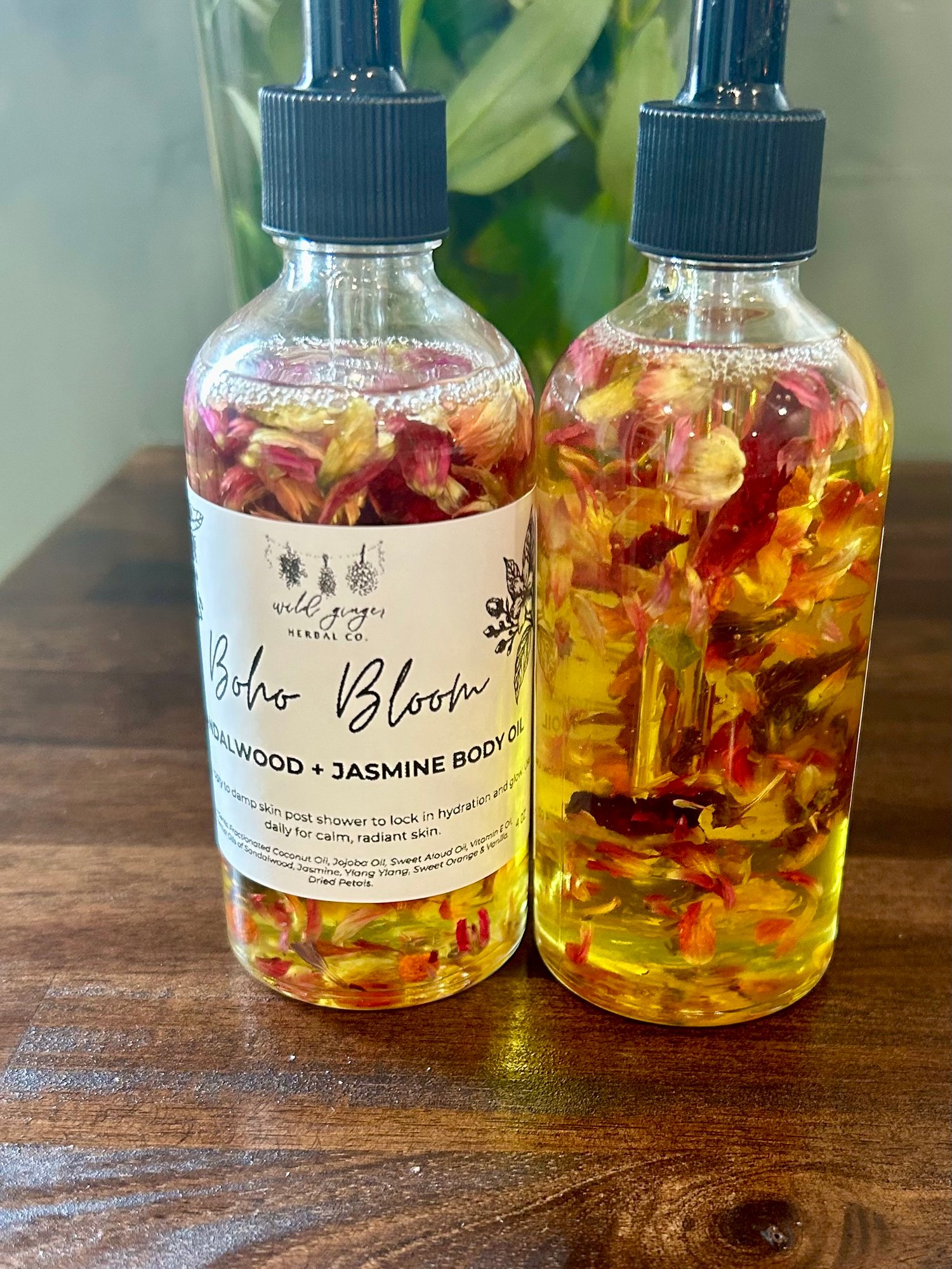 A sensual, lightweight body oil infused with jasmine, sandalwood, and delicate botanicals in a fast-absorbing base. Leaves a soft glow and a subtle, earthy-floral aroma on the skin.