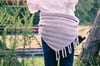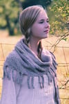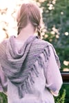 Eccentric and non-conforming, Lunatic Fringe is an off-kilter shawl that grows asymmetrically from the bottom up, and sprouts digit-like fringes on one side. The fringes are knit in as you go along by repeatedly binding off and casting on, while the body features alternating textural stripes. Cast on with a few stitches, Lunatic Fringe grows by increasing unequally along both sides to the long top edge, which is finished simply with a stretchy bind off. Like a devastated remnant found in the irradiated ruins of former civilization, Lunatic Fringe represents a ravaged relic of the cyber past, featuring a slubby yarn blend which is weirdly iridescent in duo-tonal colors.