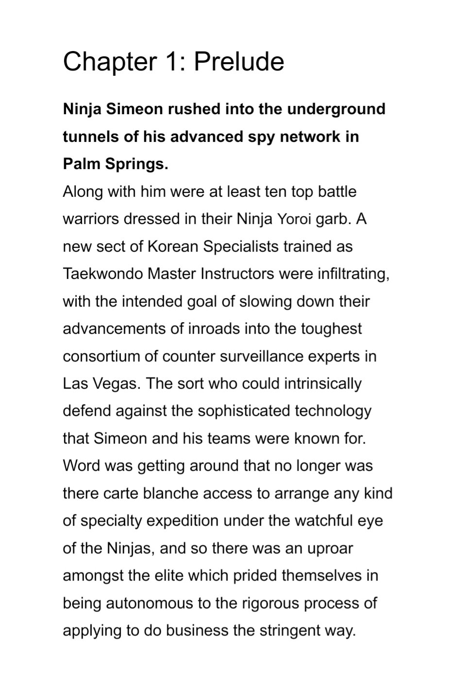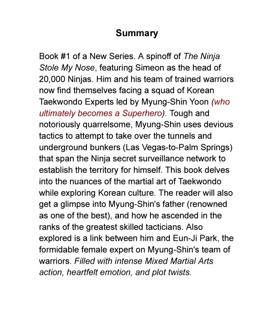 This is a spinoff of The Ninja Stole My Nose, featuring Simeon as the head of 20,000 Ninjas. Him and his team of trained warriors now find themselves facing a squad of Korean Taekwondo Experts led by Myung-Shin Yoon (who ultimately becomes a Superhero). Tough and notoriously quarrelsome, Myung-Shin uses devious tactics to attempt to take over the tunnels and underground bunkers (Las Vegas-to-Palm Springs) that span the Ninja secret surveillance network to establish the territory for himself. This book delves into the nuances of the martial art of Taekwondo while exploring Korean culture. The reader will also get a glimpse into Myung-Shin's father (renowned as one of the best), and how he ascended in the ranks of the greatest skilled tacticians. Also explored is a link between him and Eun-Ji Park, the formidable female expert on Myung-Shin's team of warriors. Filled with intense Mixed Martial Arts action, heartfelt emotion, and plot twists.