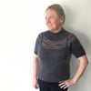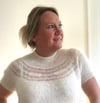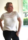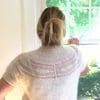 Inspired by my Wispy Haze shawl, Whisper After Dark is a fun elegant evening top that introduces you to short row wispy bursts interspersed between rounds of fingering and mohair yarns. Its romantic, light and airy yoke exudes femininity.