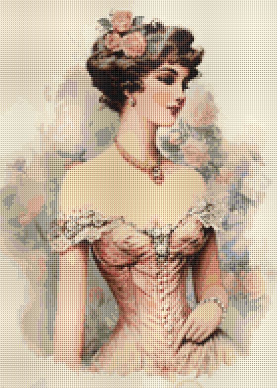 Stitch a graceful glimpse into the past with this elegant Victorian lady cross stitch pattern. Featuring a refined woman in a soft corseted gown with delicate florals and classic period styling, this design captures the romance and timeless beauty of vintage portrait art. Subtle shading and gentle color transitions give the finished piece a painterly, heirloom feel.