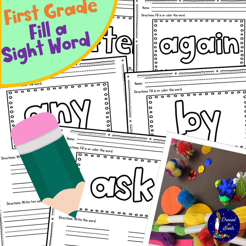 This fun and creativity filled book will allow students to have fun using string, balls, playdoh, shells or other objects to fill in the words. Students will get writing practice with each of the 41 first grade Dolch words and also write sentences with each to increase fluency in reading and writing.