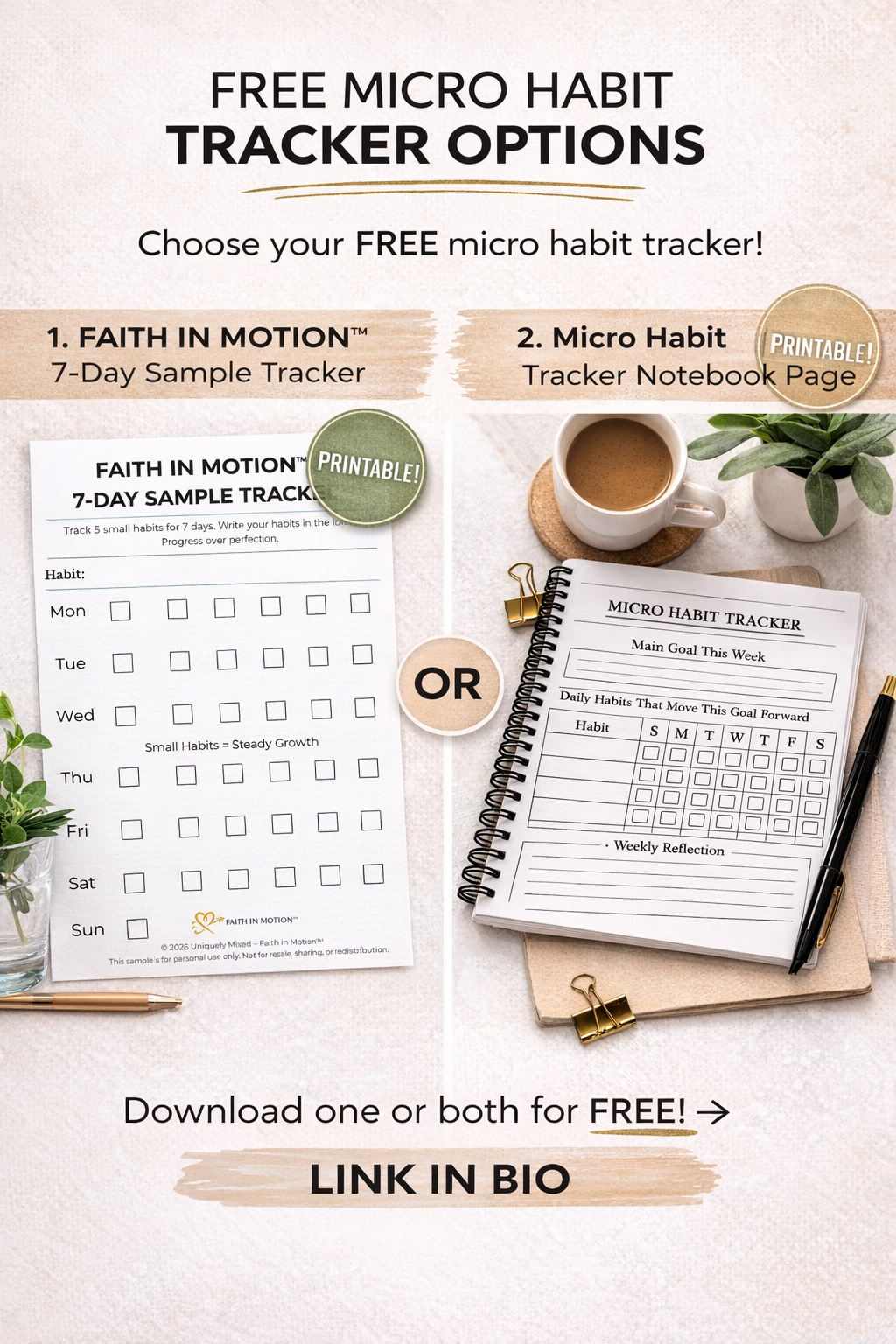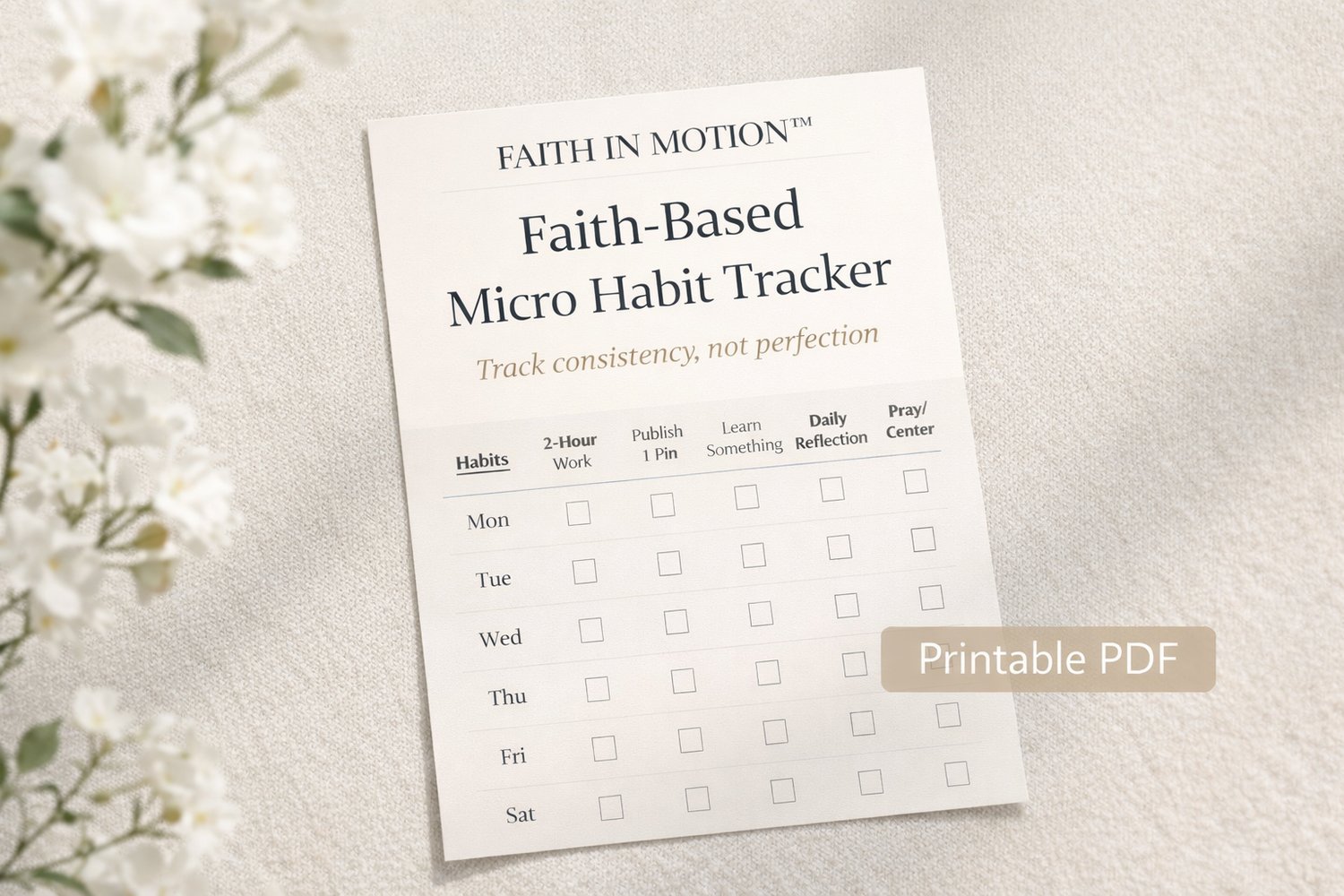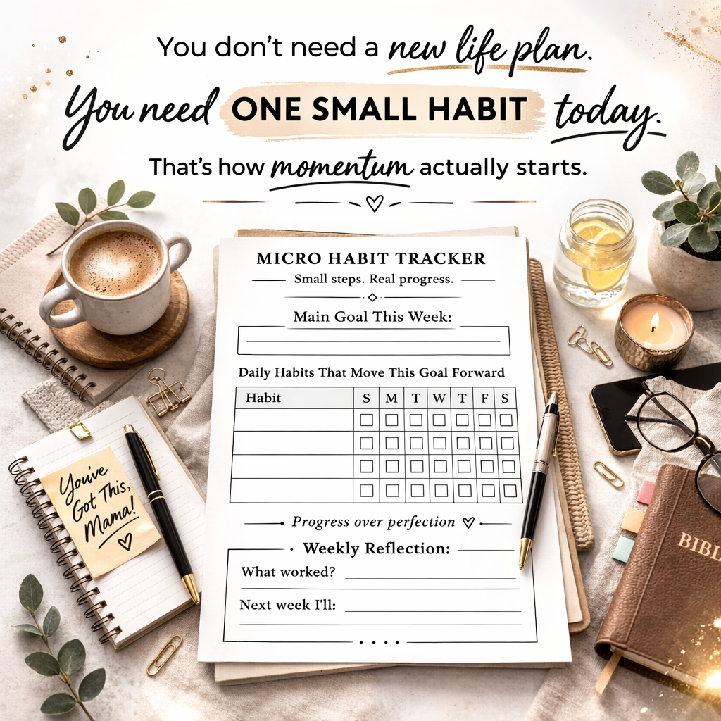 The Faith in Motion™ Micro Tracker Pack was created to help busy moms track progress without pressure — using small, manageable steps that fit real life.