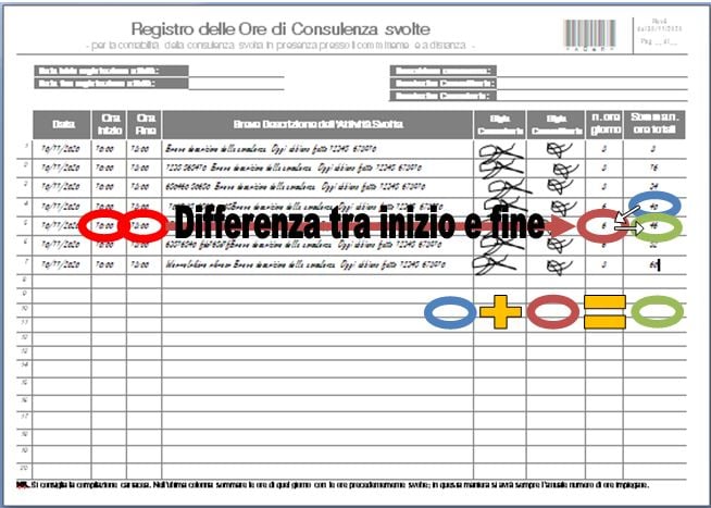 - Per il calcolo delle ore, occorre innanzitutto fare la differenza tra inizio e fine ore per quella giornata e stornate le eventuali ore di pausa; bisogna poi trascrivere il risultato nella penultima colonna. Infine occorre sommare, alle precedenti ore erogate, le ore di quel giorno nell'ultima colonna.