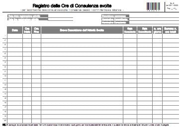 Il Modulo registro orario consulenza, in formato A4 orizzontale, consiste in una tabella per la registrazione di inizio e fine giornaliero della consulenza effettuata, al fine di tenere traccia e contabilizzare il lavoro svolto. Tale strumento può essere particolarmente utile nei casi di consulenze che si protraggono per molto tempo e che comportano una palese difficoltà di essere tenute sotto controllo. Tale sistema comporta vantaggi sia per il consulente e sia per il committente, poiché permette da un lato la contabilizzazione del lavoro, nell'ottica del pagamento, e dall'altro lato l'esplicitazione dello stato di avanzamento. Il Modulo permette di rendere più sistematico il rapporto lavorativo consulenziale.