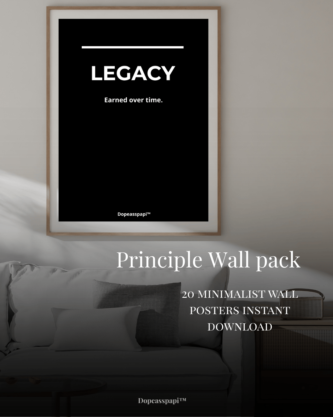 The Legacy Principles Wall Pack is a curated collection of 20 minimalist wall posters, each centered on a single timeless principle. Designed to reinforce discipline, clarity, and long-term thinking — without distraction.