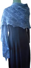 This crescent shawl starts with the lace edge, either long or short, narrow or wide. There are ten sizes to choose from, so you can get the perfect shawl for you from this simple diamond pattern. Choose size to knit based on lace length and inner edge dimensions. The last diamond rows begin the shaping that ends with garter stitch short rows, making what would be a wide rectangle into a pleasing crescent.