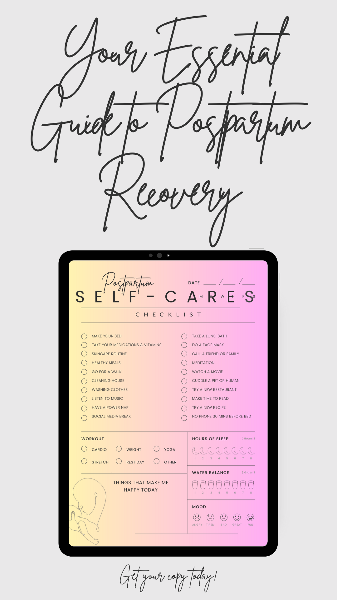 Our checklist offers actionable steps and practical advice, from nutritious meal planning and hydration tips to gentle postpartum exercises and essential mental health resources.