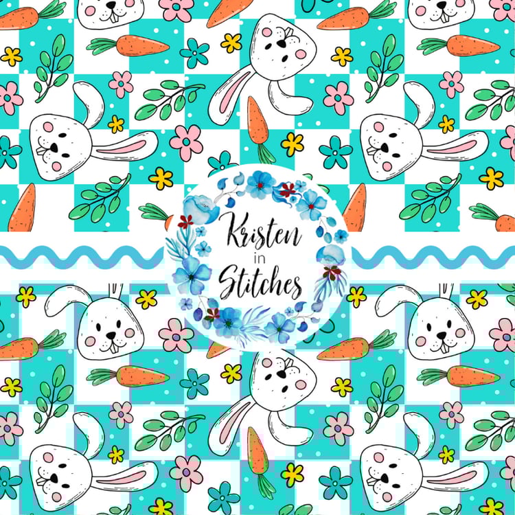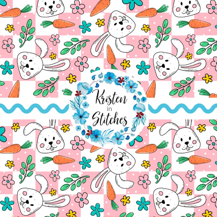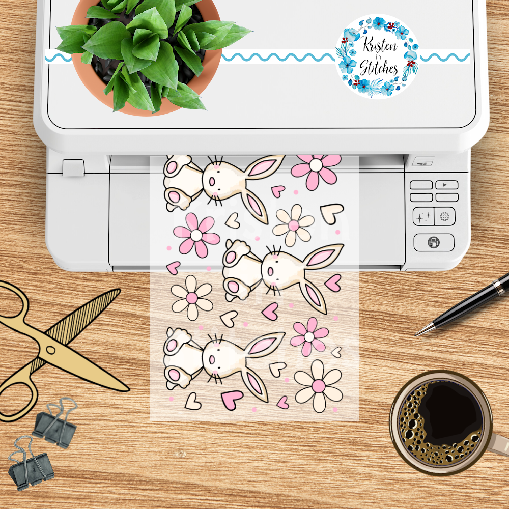 Features sweet bunnies and pink and ivory daisy flowers with hearts.
