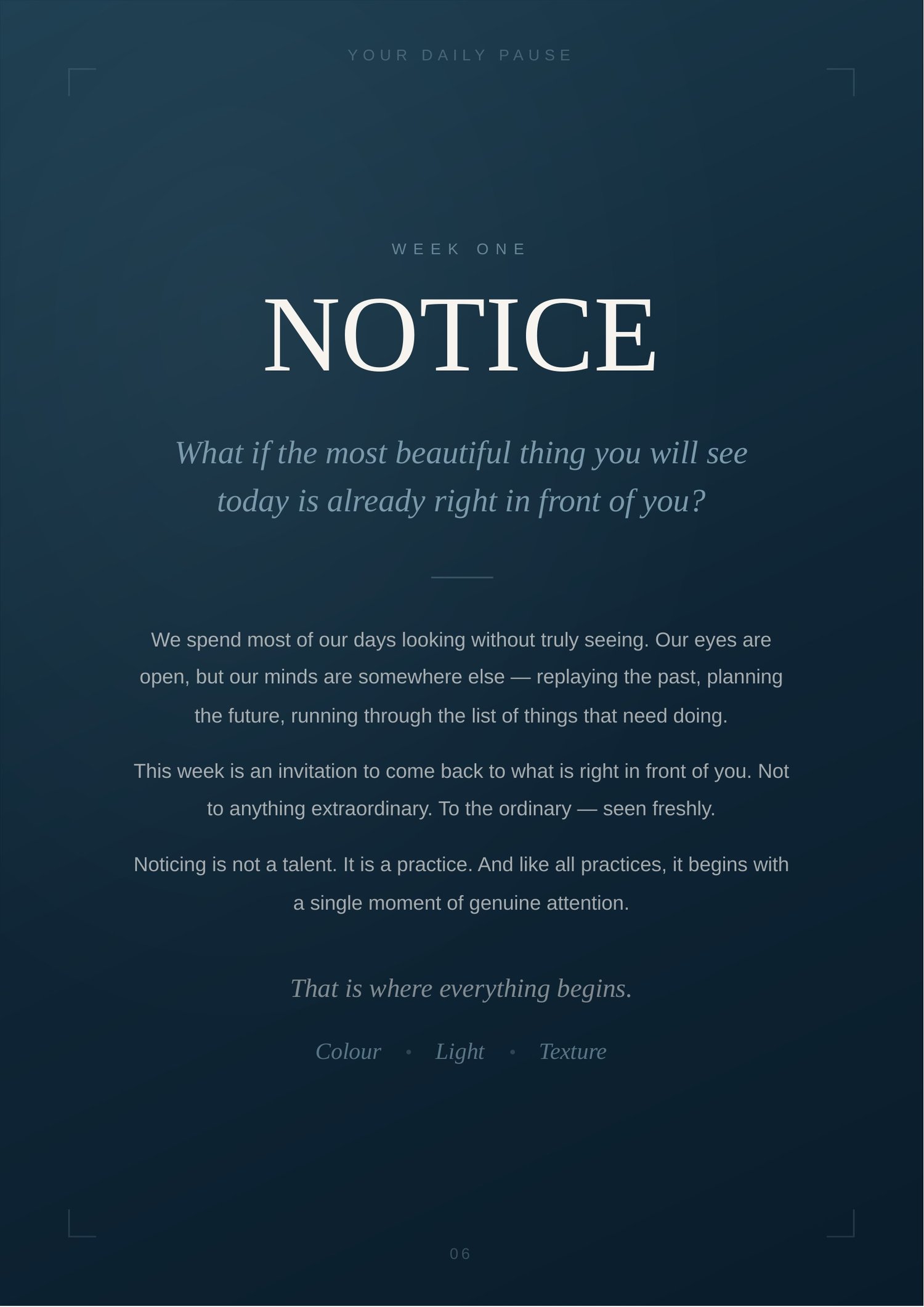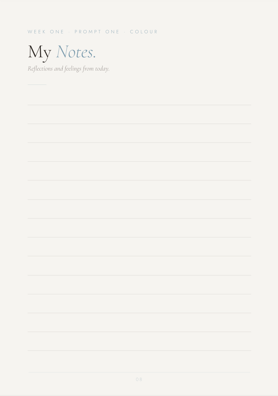 Inside, you will move through 12 gentle prompts across 4 weeks — each one designed to help you pause, notice more deeply, and reconnect with beauty, presence, and your own creative eye.