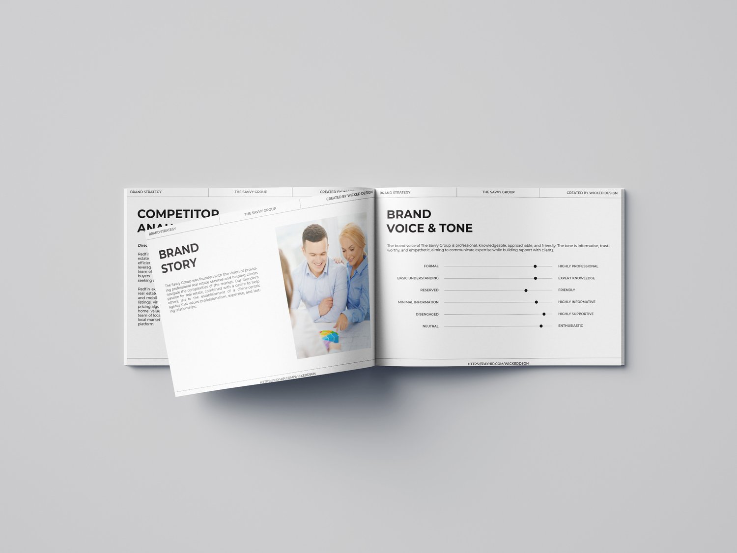 A clean, modern multi-page layout built for brand strategy: brand purpose, values, personas, mission, vision, competitor analysis, brand story, messaging, imagery, marketing strategy, and more.