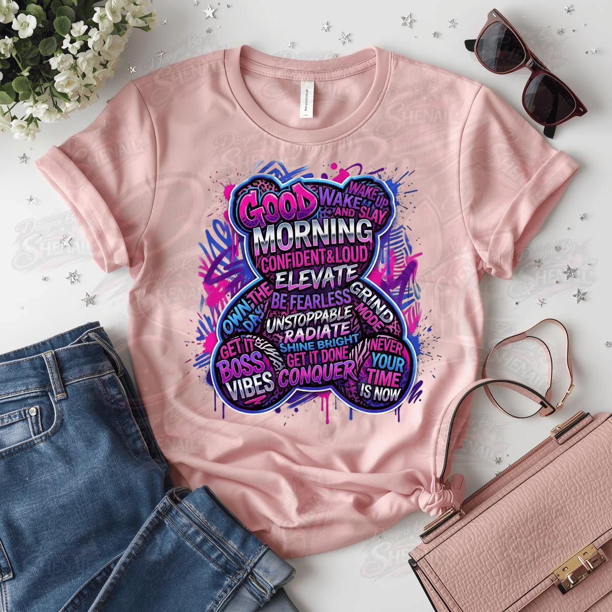 Turn your mindset into your power with this bold, high-energy affirmation design packed with confidence, hustle, and boss vibes. Featuring vibrant pink, purple, and blue tones with graffiti-style elements, this design is made to stand out and speak loud. From “Good Morning” to “Unstoppable,” “Boss Vibes,” and “Conquer,” every word in this design is a declaration of confidence, growth, and fearless energy. It’s perfect for women who are building, grinding, glowing, and leveling up every single day.