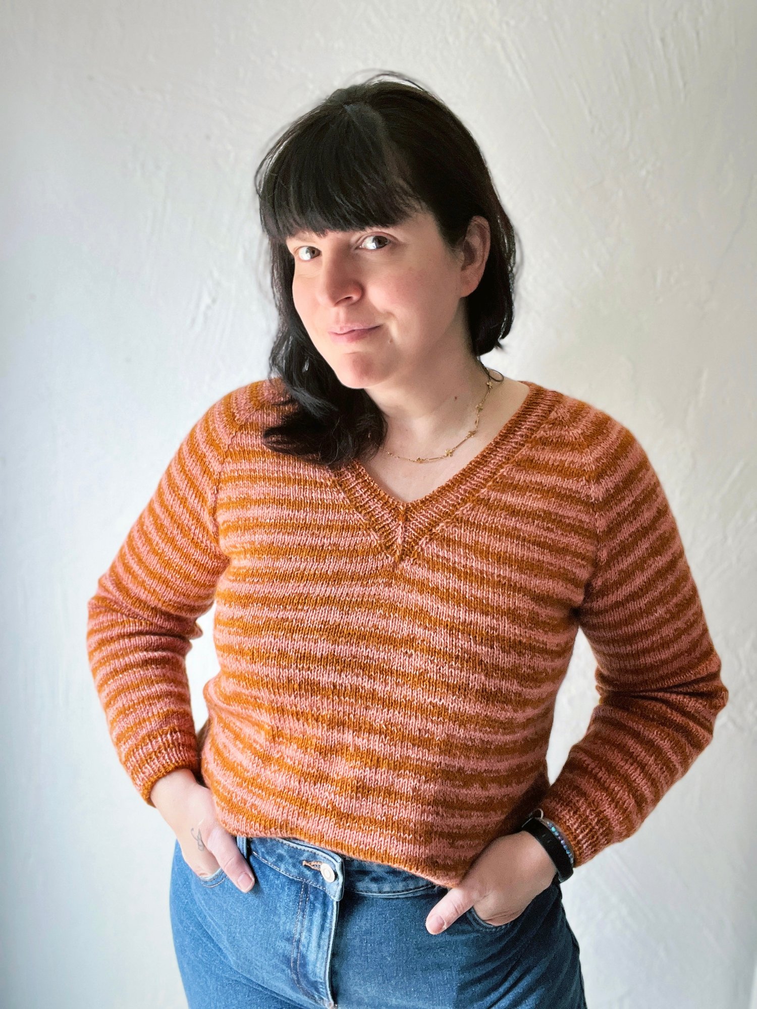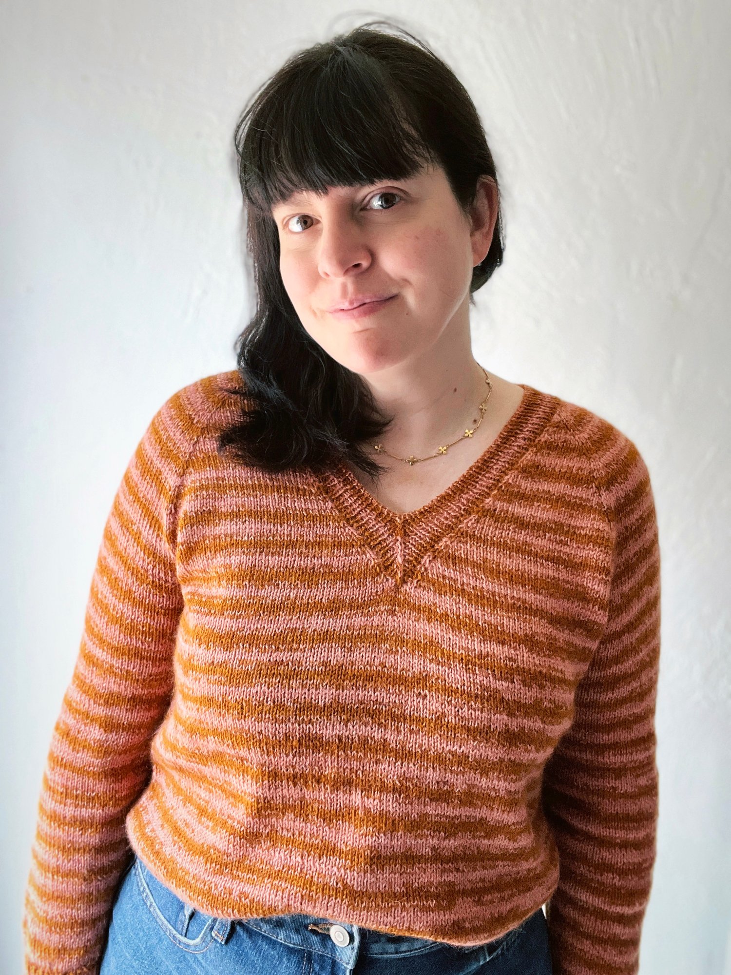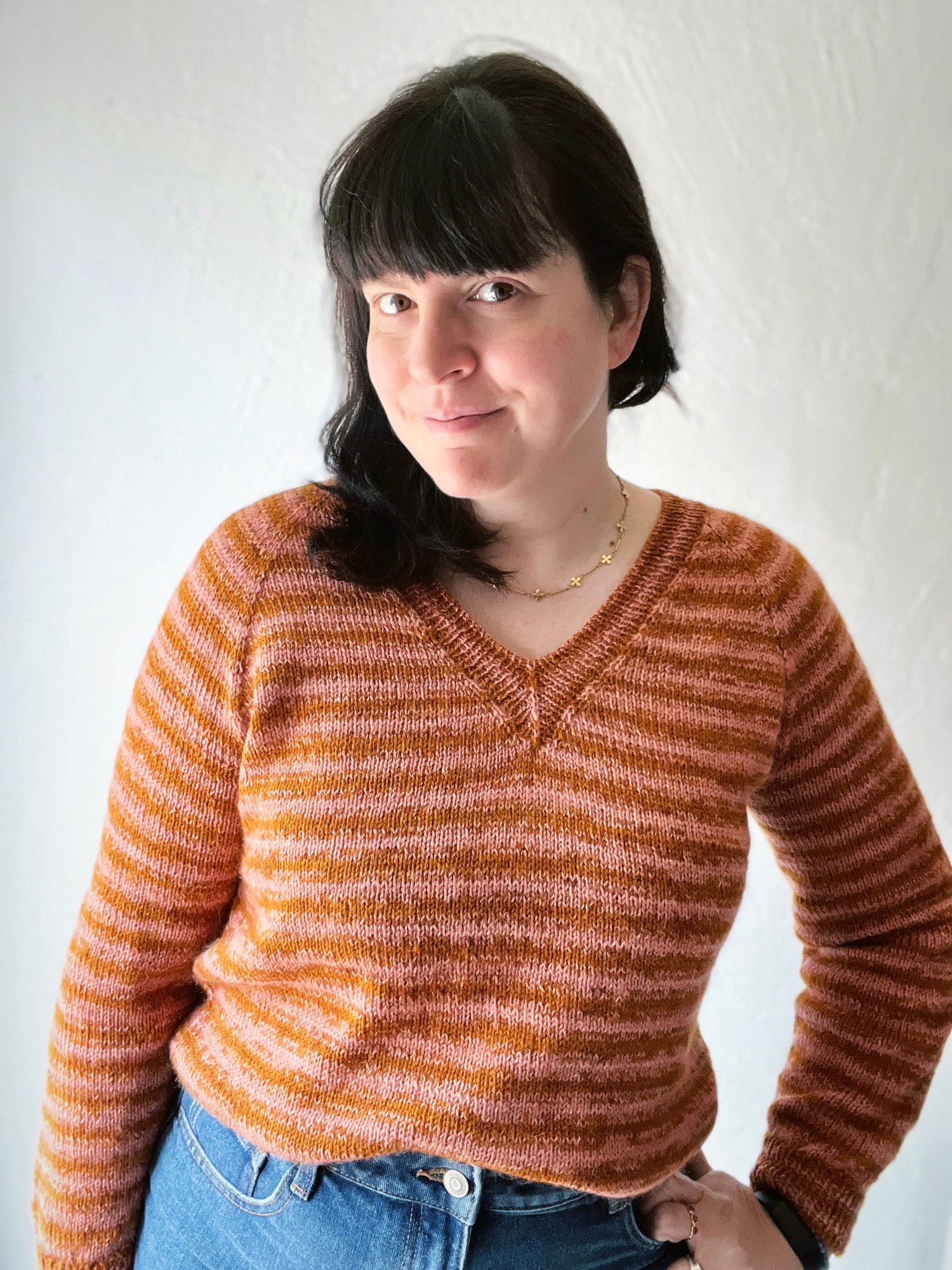 Sur la base d’un modèle simple - un pull à col V avec des emmanchures raglan - j’ai cherché à apporter une autre dimension grâce au travail des coloris. Le contraste des rayures et leur fondu apportent du rythme et de la légèreté à ce basique, tout en lui conférant un caractère unique.