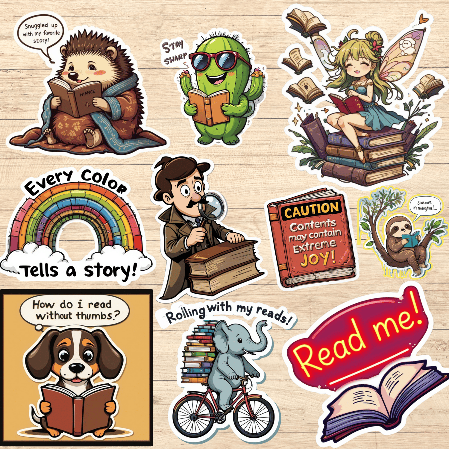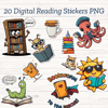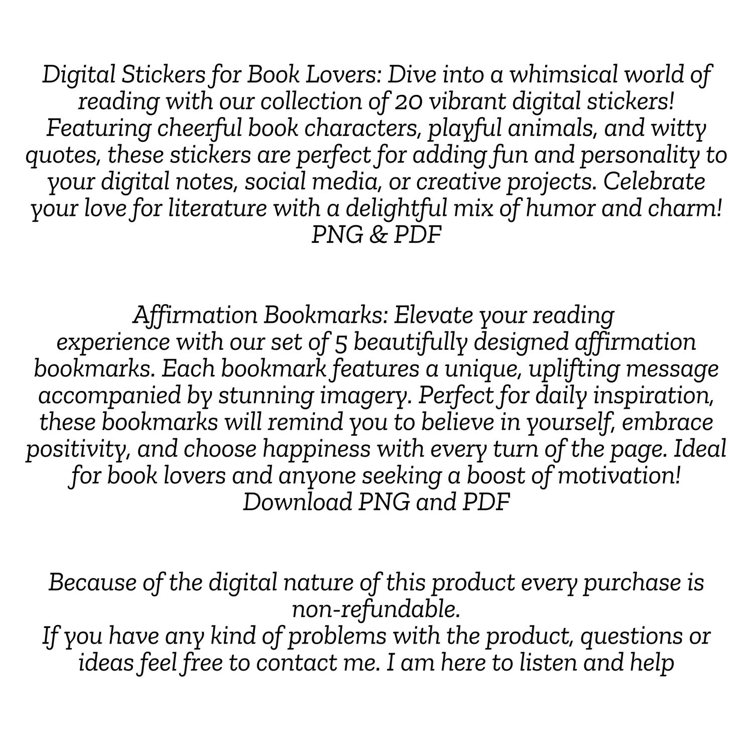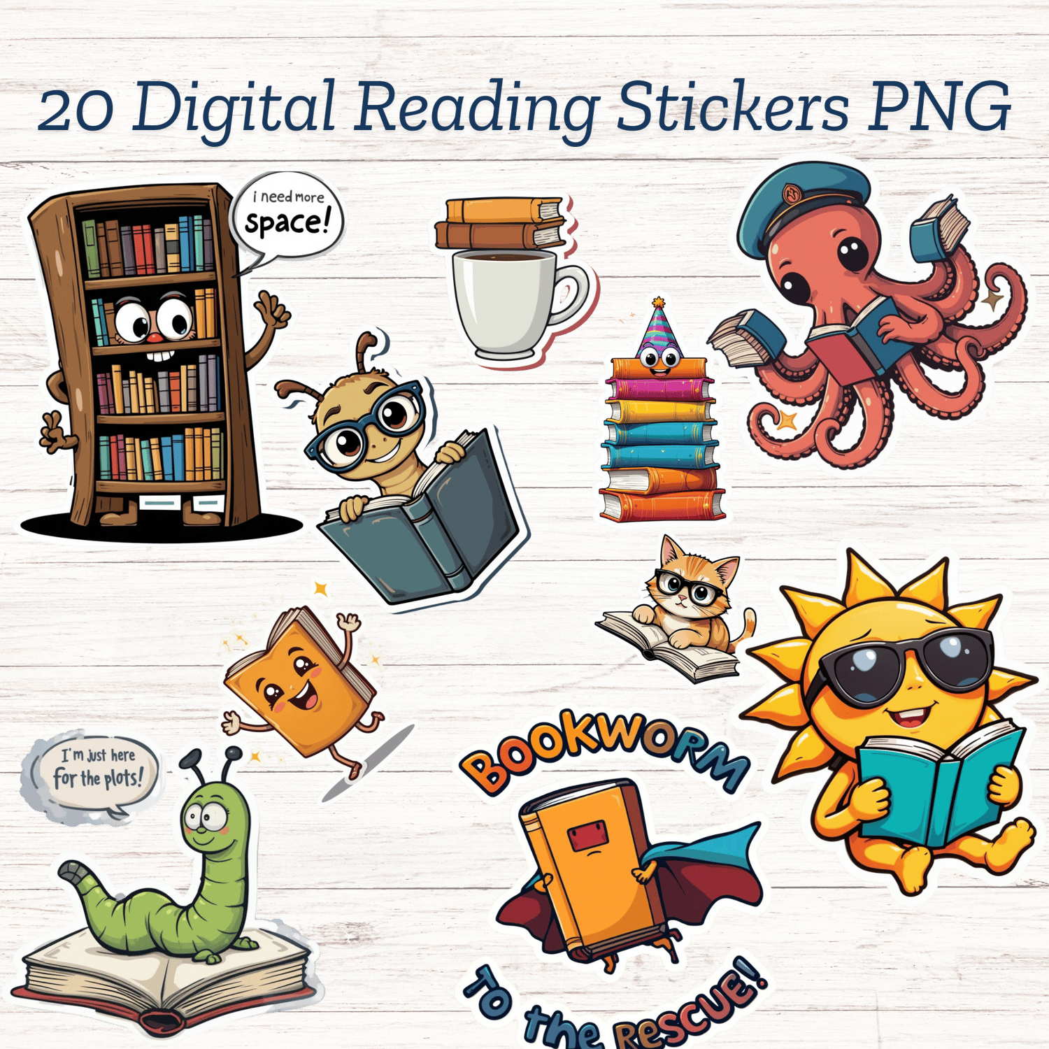 Digital Stickers for Book Lovers: Dive into a whimsical world of reading with our collection of 20 vibrant digital stickers! Featuring cheerful book characters, playful animals, and witty quotes, these stickers are perfect for adding fun and personality to your digital notes, social media, or creative projects. Celebrate your love for literature with a delightful mix of humor and charm!